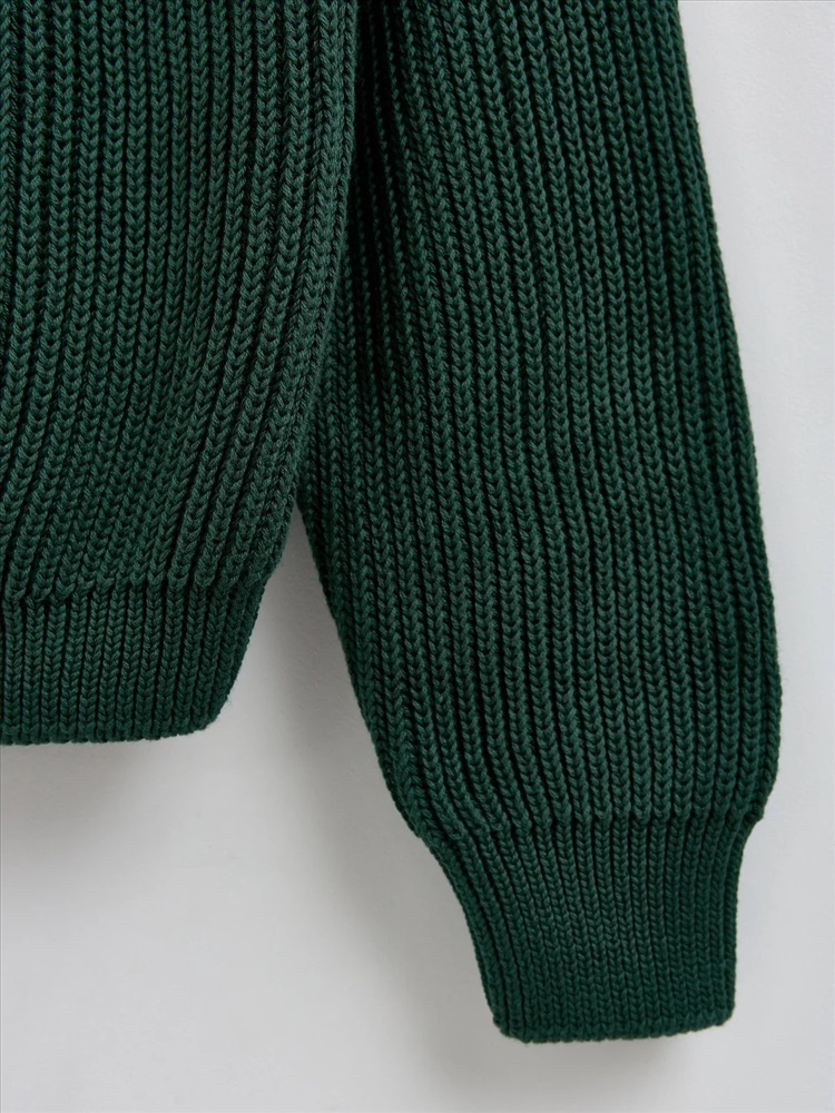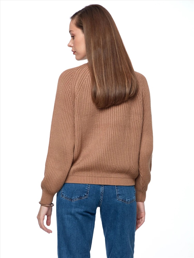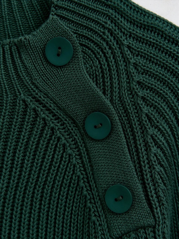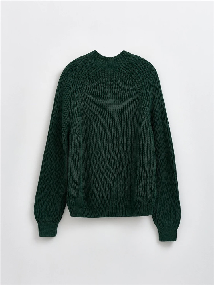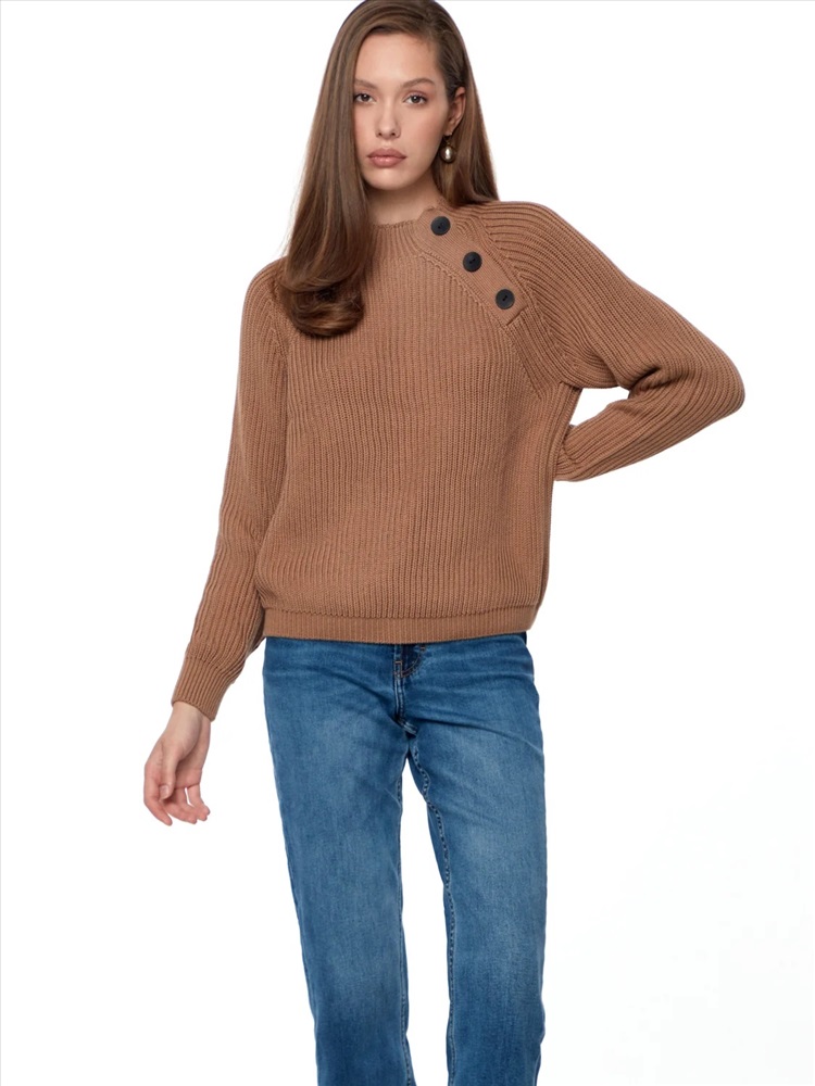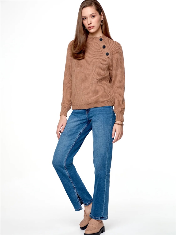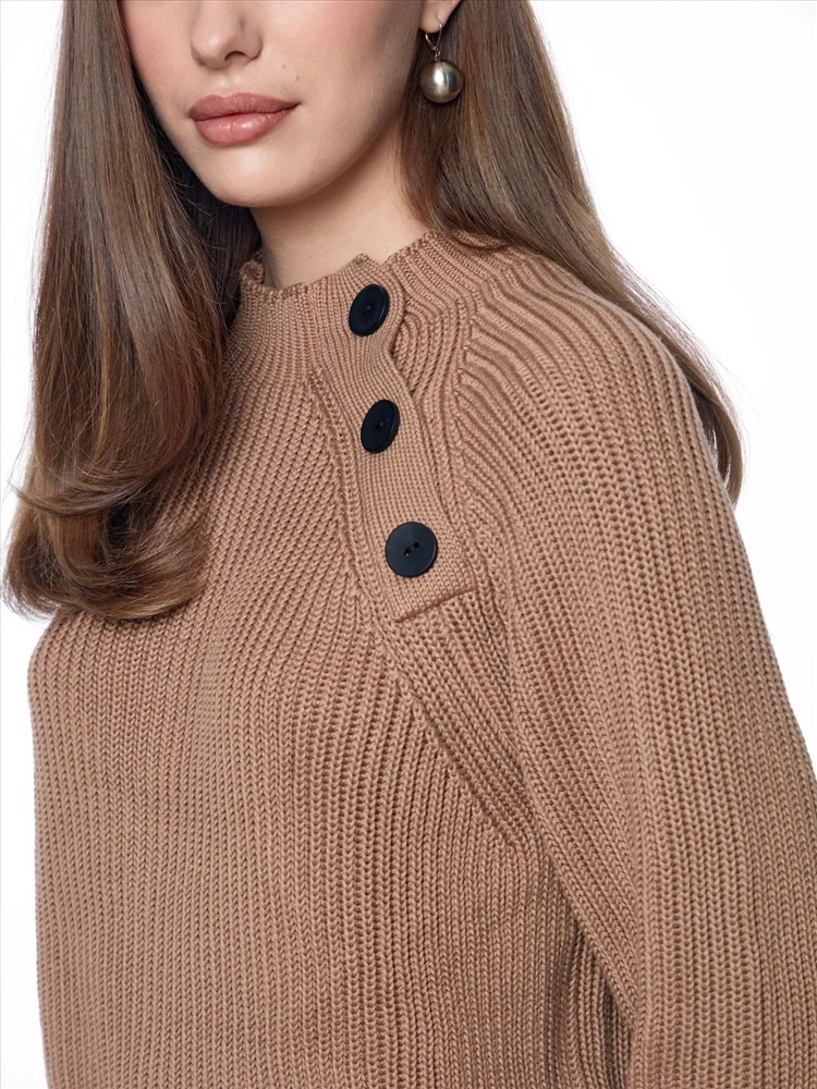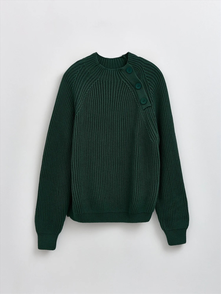 Фактурный джемпер объемного силуэта с планкой, имитирующей застежку на пуговицы, станет основной для множества новых образов: модель отлично сочетается с денимом, брюками и юбками.