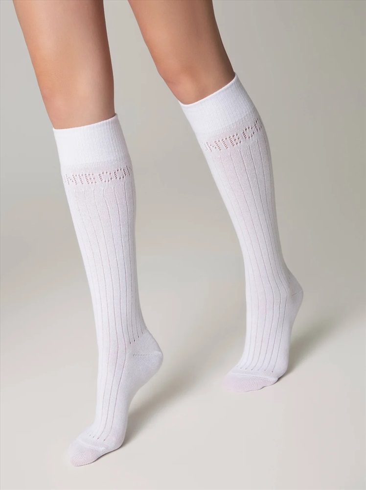 Гольфы из хлопка в рубчик с ажурной надписью «Сonte» станут финальным штрихом стильного образа. Гольфы мягкие, тактильно приятные, плотно облегают ногу и не сползают благодаря эластичной широкой резинке.