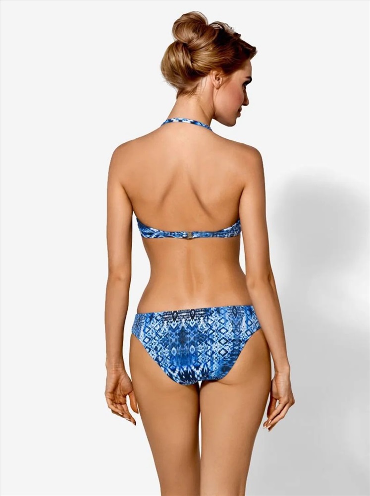 Лиф купального костюма с жесткой формованной чашкой и вкладышем «PUSH-UP». Фиксируется съемной бретелью за шею и застежкой по спине. Чашки задрапированы по боку и соединены по центру между собой контрастными по цвету шнурками.