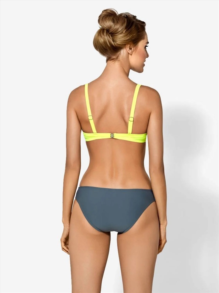 Лиф купального костюма с жесткой формованной чашкой «PUSH-UP» на каркасах, оформлен шнуром контрастного цвета и декоративным украшением по ластовице. Фиксируется регулируемой бретелью и застежкой по спине.