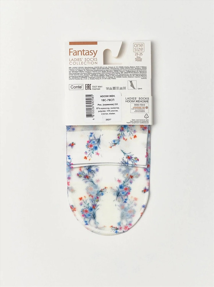 Производитель: Conte elegant; Артикул поставщика: 18С-76СП; Состав: полиэстер 87%, эластан 13%; Год: 2022; Страна: Беларусь; Российский размер: 23, 25 Эластичные носки с оригинальными принтами смотрятся так стильно и индивидуально, что вам не захочется прятать их под одеждой.