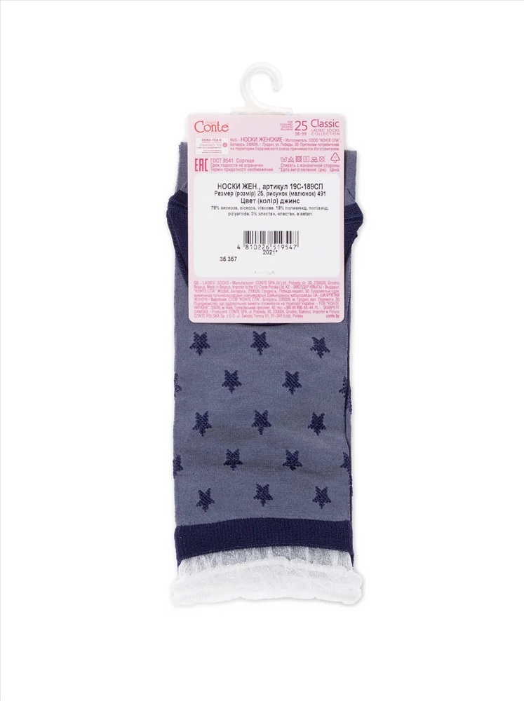 Производитель: Conte elegant; Российский размер: 23; Артикул поставщика: 19С-189СП; Состав: вискоза 78%, полиамид 19%, эластан 3%; Год: 2021; Страна: Беларусь Носки из вискозы с глянцевым рисунком и декоративной прозрачной сеткой по краю резинки созданы для девушек, которые любят носить оригинальные носочки и с удовольствием подчеркивают свою индивидуальность. Носки смотрятся так стильно, что их хочется надевать снова и снова.