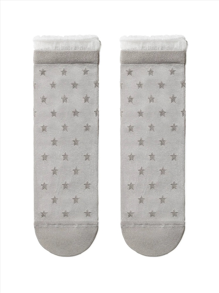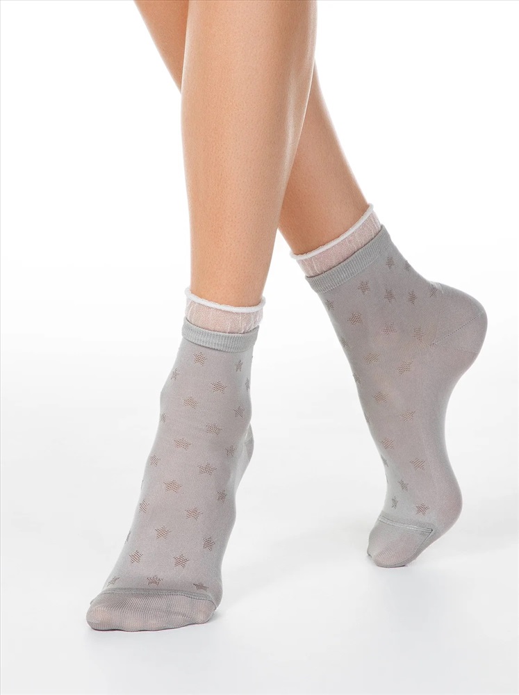 Носки из вискозы с глянцевым рисунком и декоративной прозрачной сеткой по краю резинки созданы для девушек, которые любят носить оригинальные носочки и с удовольствием подчеркивают свою индивидуальность.