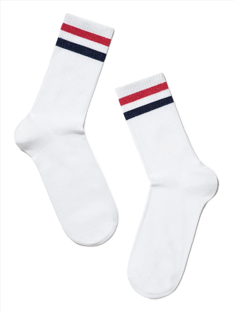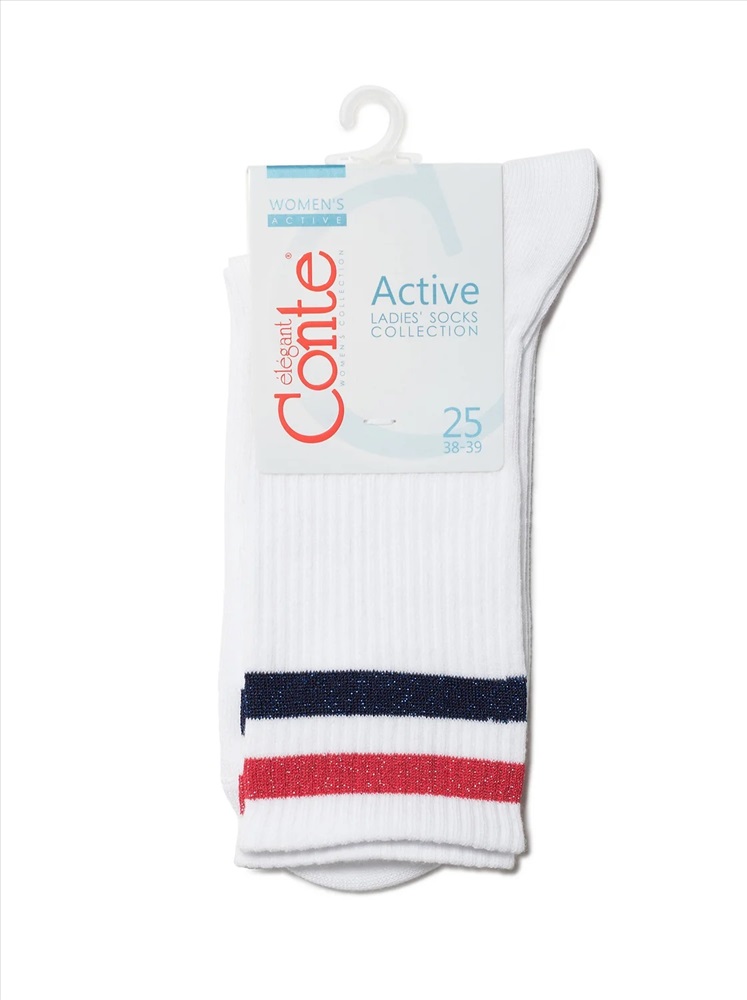 Хлопковые носки с яркими полосками из люрекса смотрятся так стильно и оригинально, что вам не захочется прятать их под одеждой. Смело носите трендовые носочки ACTIVE в стиле спорт-шик и с удовольствием подчеркивайте свою индивидуальность.
