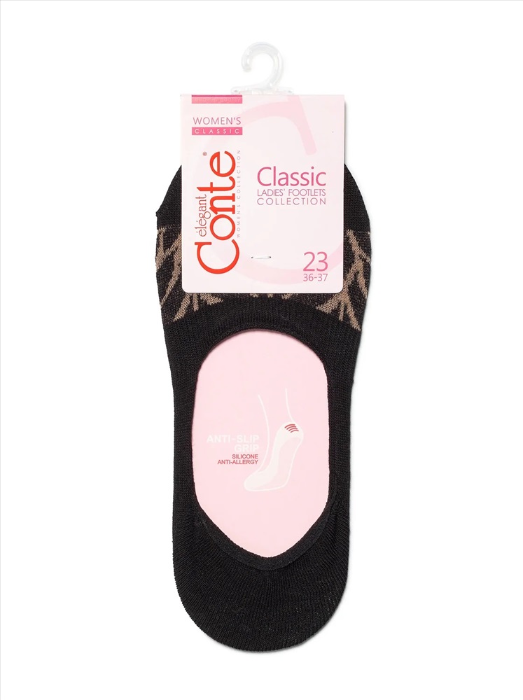 Производитель: Conte elegant; Российский размер: 23; Артикул поставщика: CLASSIC; Состав: хлопок 70%, полиамид 25%, эластан 5%; Год: 2021; Страна: Беларусь Мягкие и эластичные подследники из хлопка. На запяточной части нанесено антискользящее покрытие для предотвращения сползания. LYCRA®: подследники, в составе которых есть волокно LYCRA®, превосходно растягиваются во всех направлениях, восстанавливают свою первоначальную форму раз за разом, медленно изнашиваются, не съезжают с ноги во время носки и не оставляют красных следов от резинки.