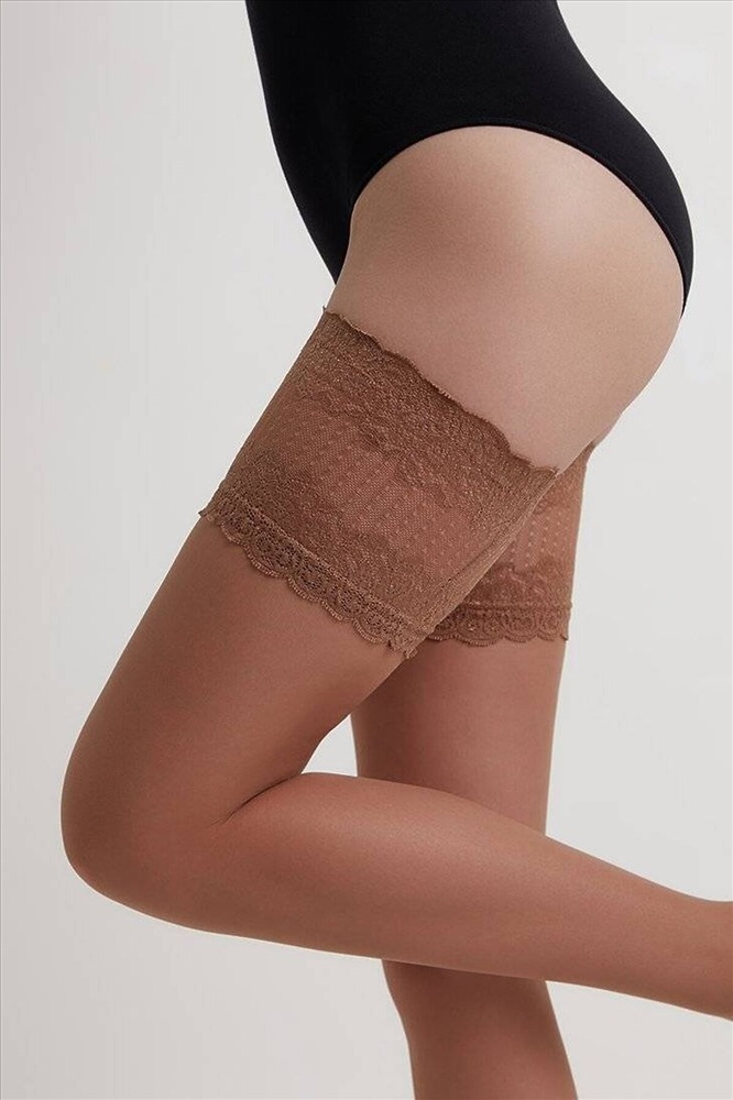 Тонкие эластичные фантазийные чулки 20 ден с широкой кружевной самоподдерживающейся резинкой.