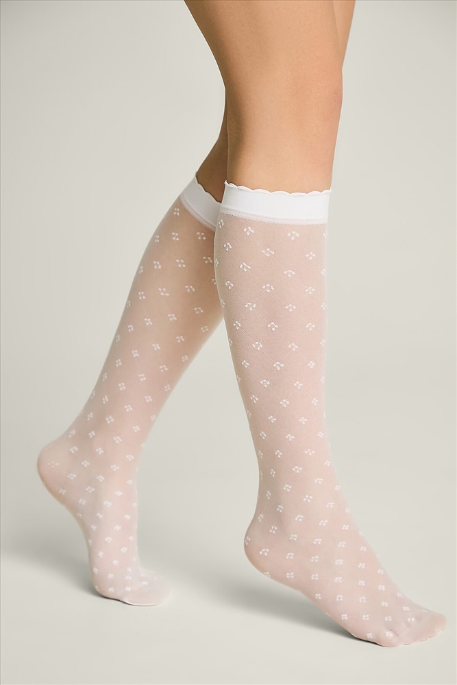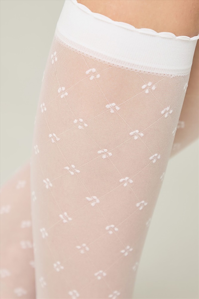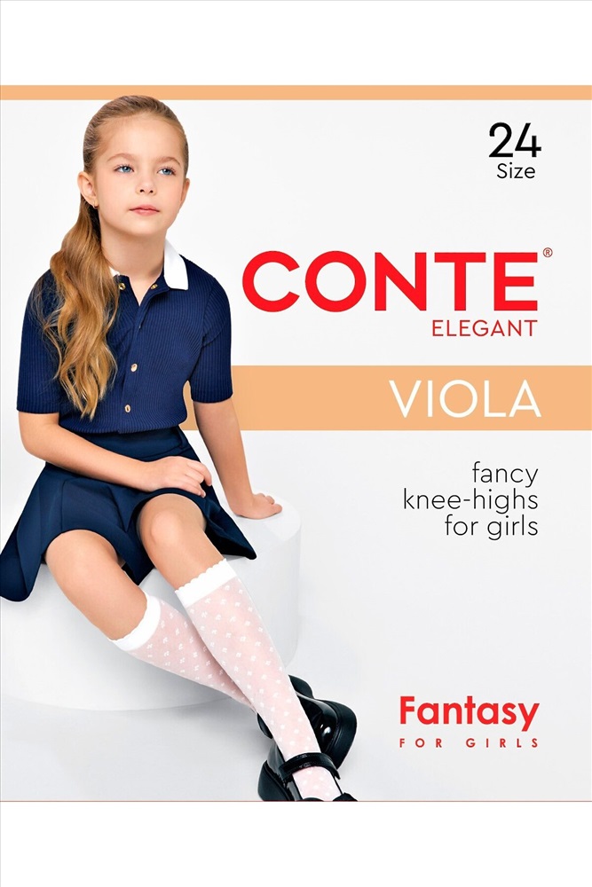 Тонкие гольфы с геометрическим рисунком VIOLA станет прекрасным дополнением юной модницы. Модель поможет создать как нарядный, так и лаконичный образ. 20 Den тонкие и эластичные рисунок «ромбы с точками» борт с пикотом без пятки