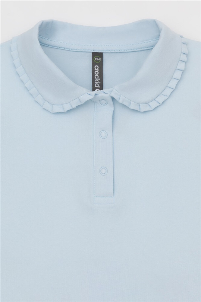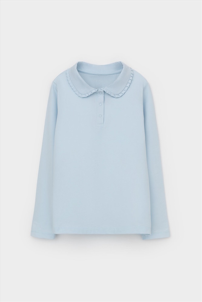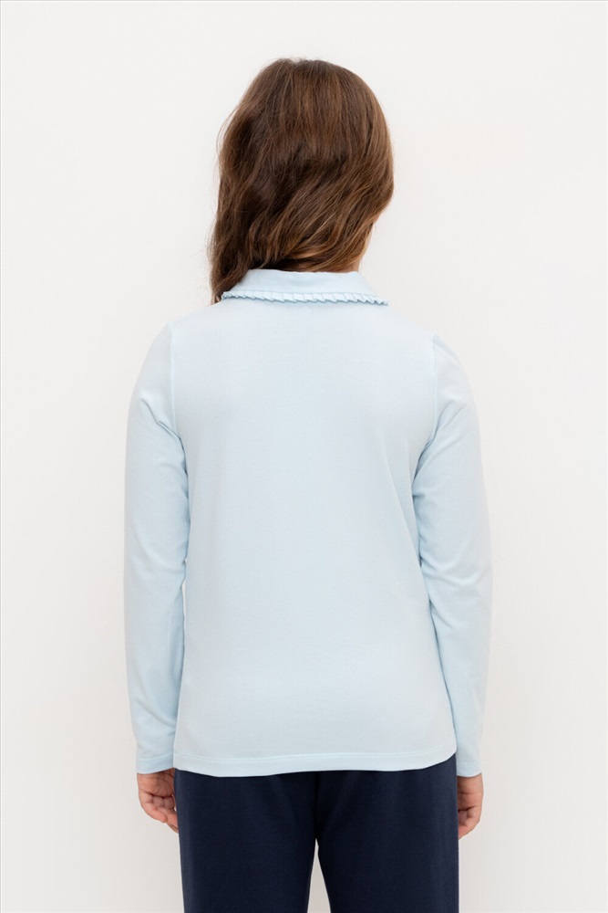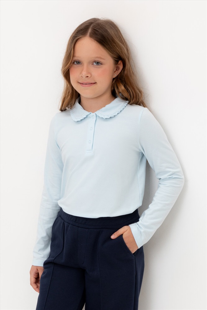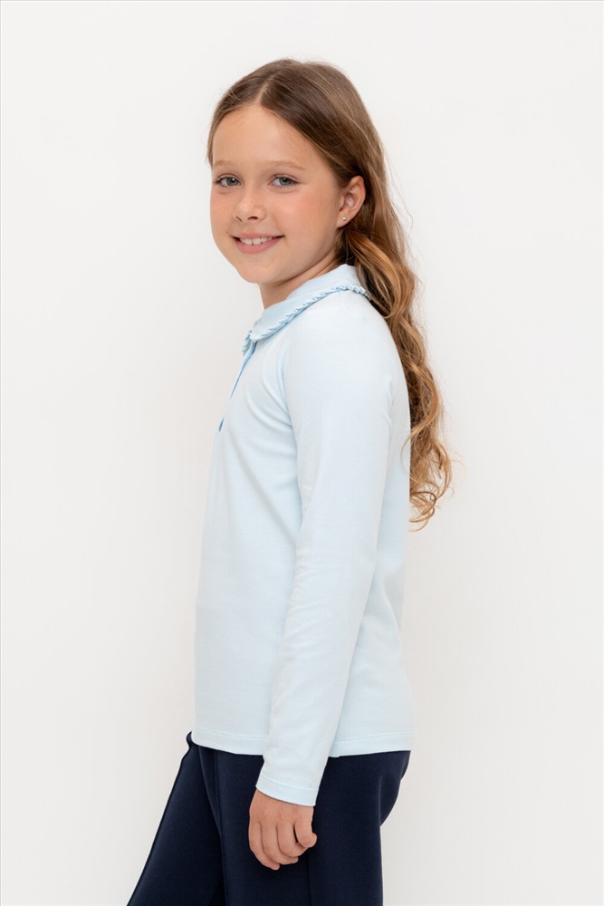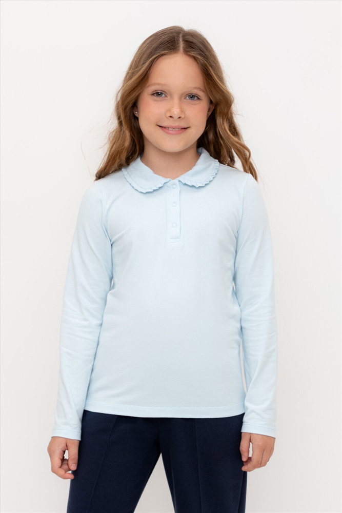 Блузка школьная для девочки с отложным воротником из эластичного трикотажа супрем с эластаном. Благодаря эластану блузка будет долго сохранять свою форму и выглядеть опрятно. Застёгивается на планку с кнопками. Воротник украшен оборкой. Рукава и низ изделия обработаны плоскими швами.