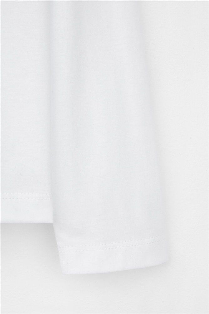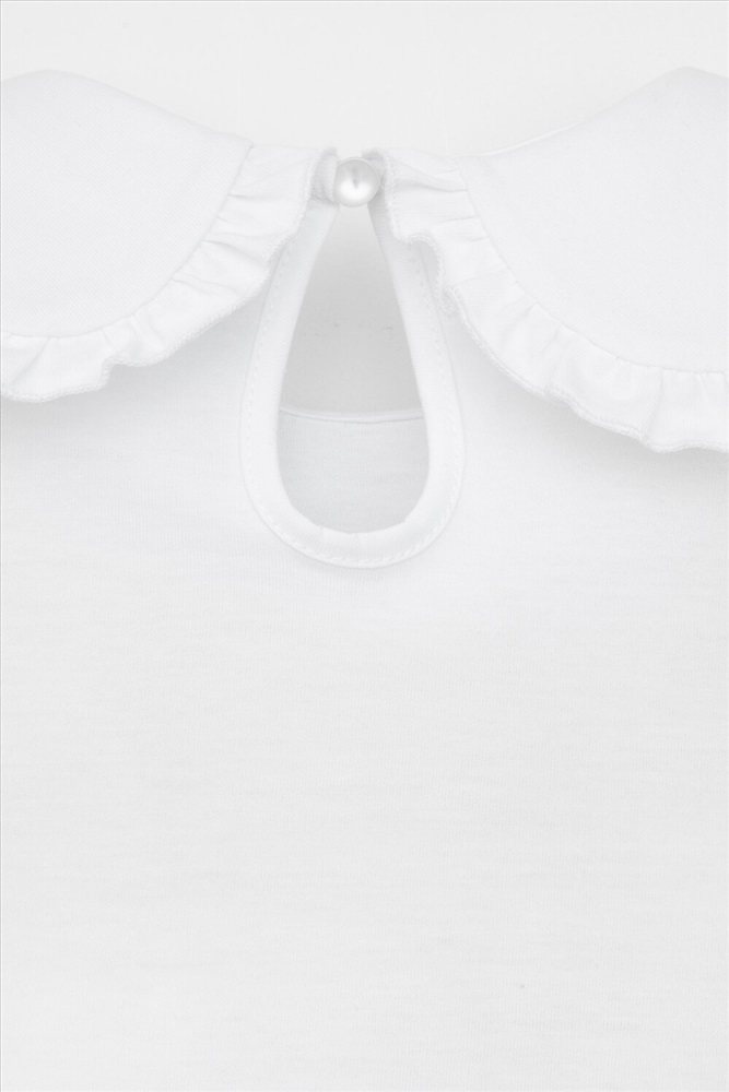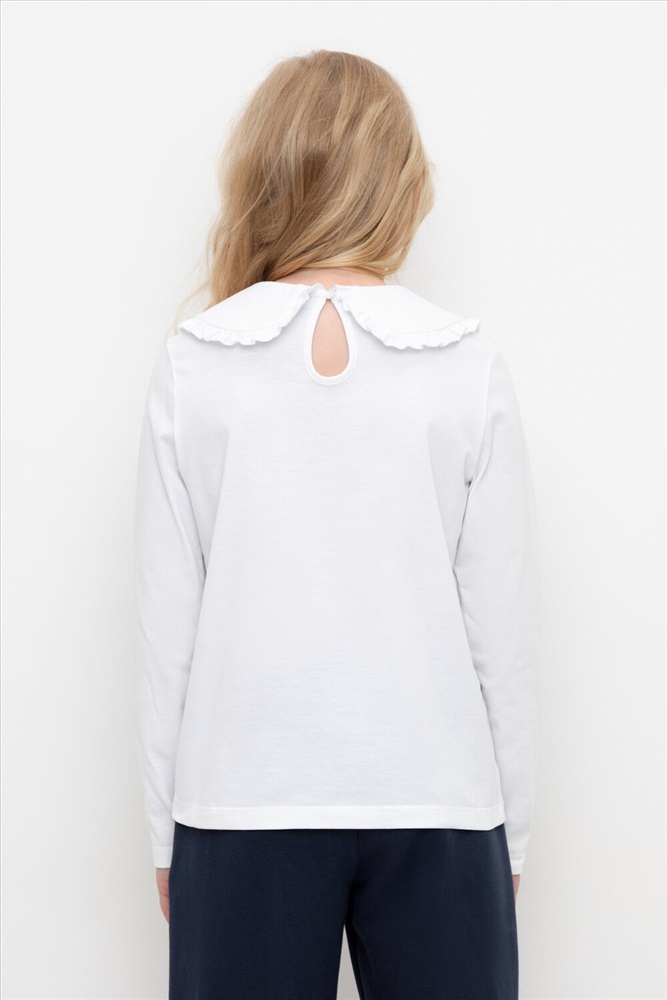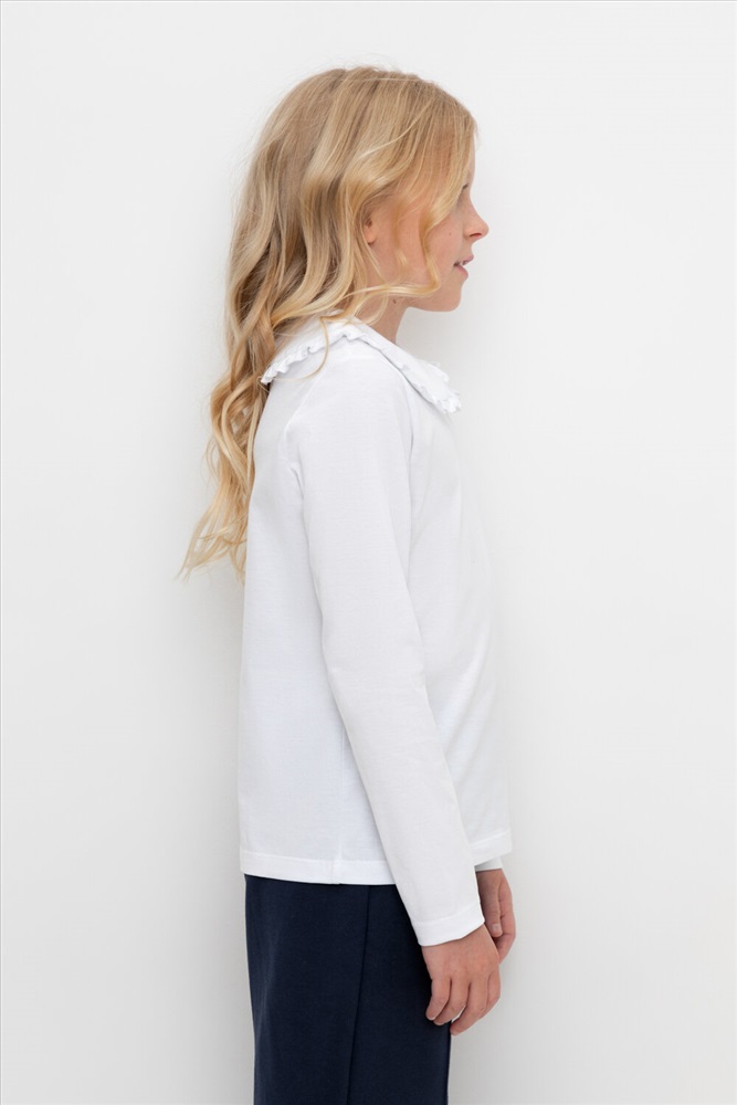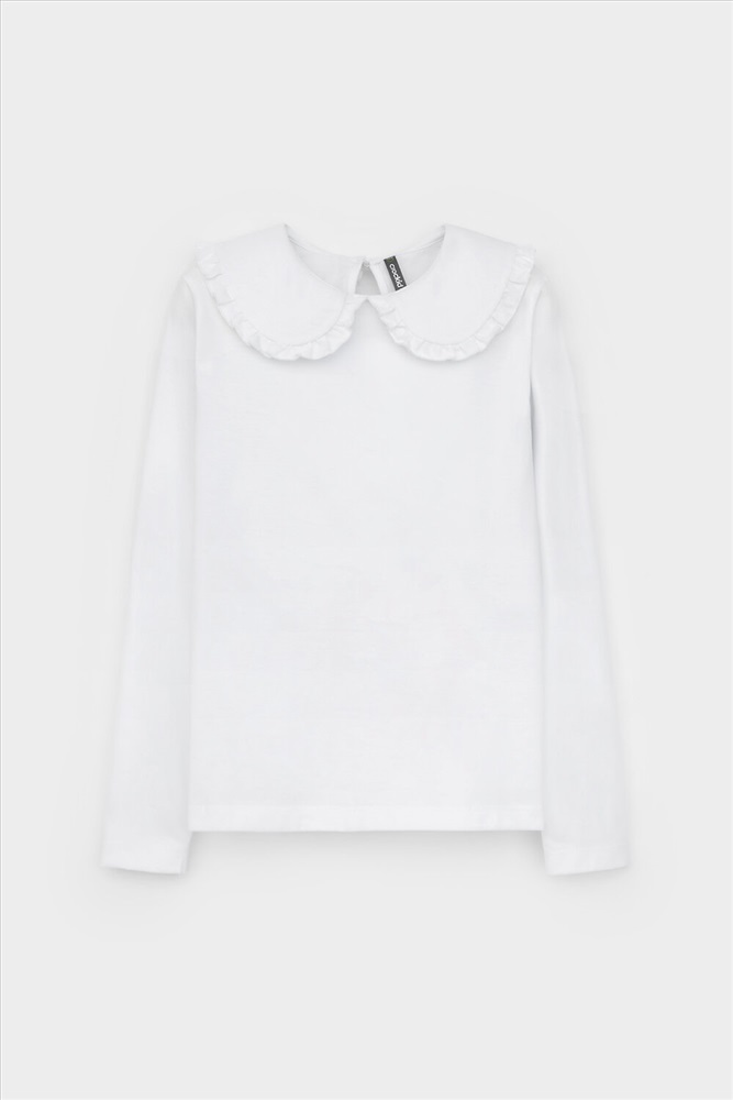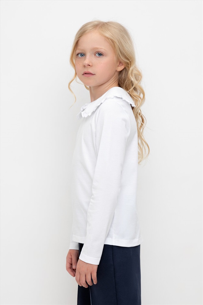 Блузка школьная для девочки с отложным воротником из трикотажа супрем. Застёгивается на пуговицу и петельку из шляпной резины. Воротник украшен оборкой. Рукава и низ изделия обработаны плоскими швами.
