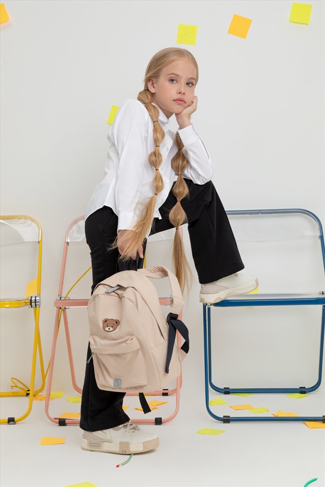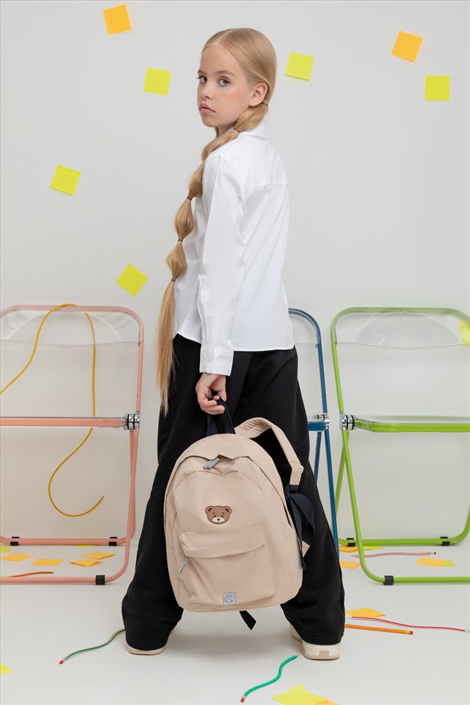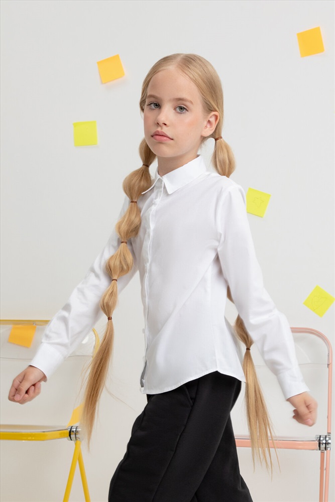 Классическая блузка для девочки с отложным воротником. Застегивается спереди на планку с пуговицами. Длинные втачанные рукава с манжетами регулируются по ширине.