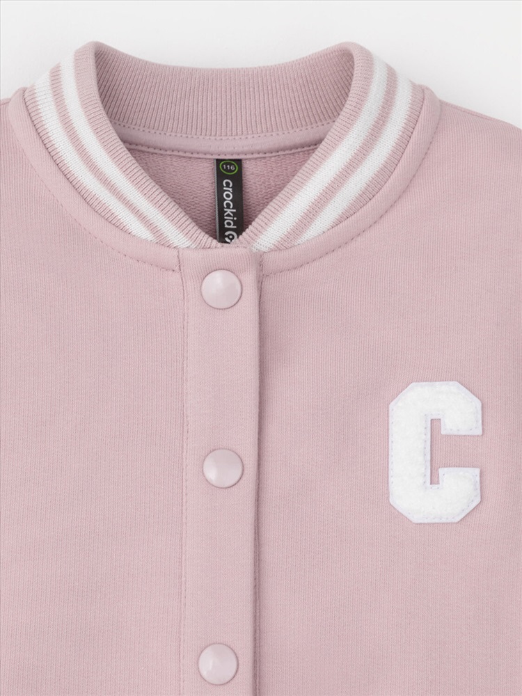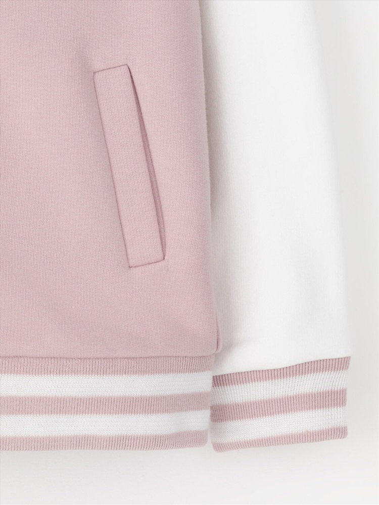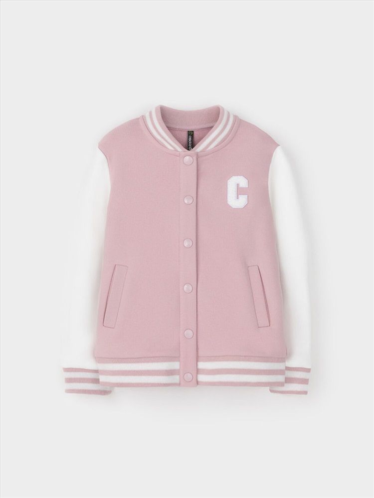 Бомбер для девочки с контрастными рукавами из мягкого трикотажа. Воротник, манжеты и пояс - вязаные. Спереди карманы с листочкой.