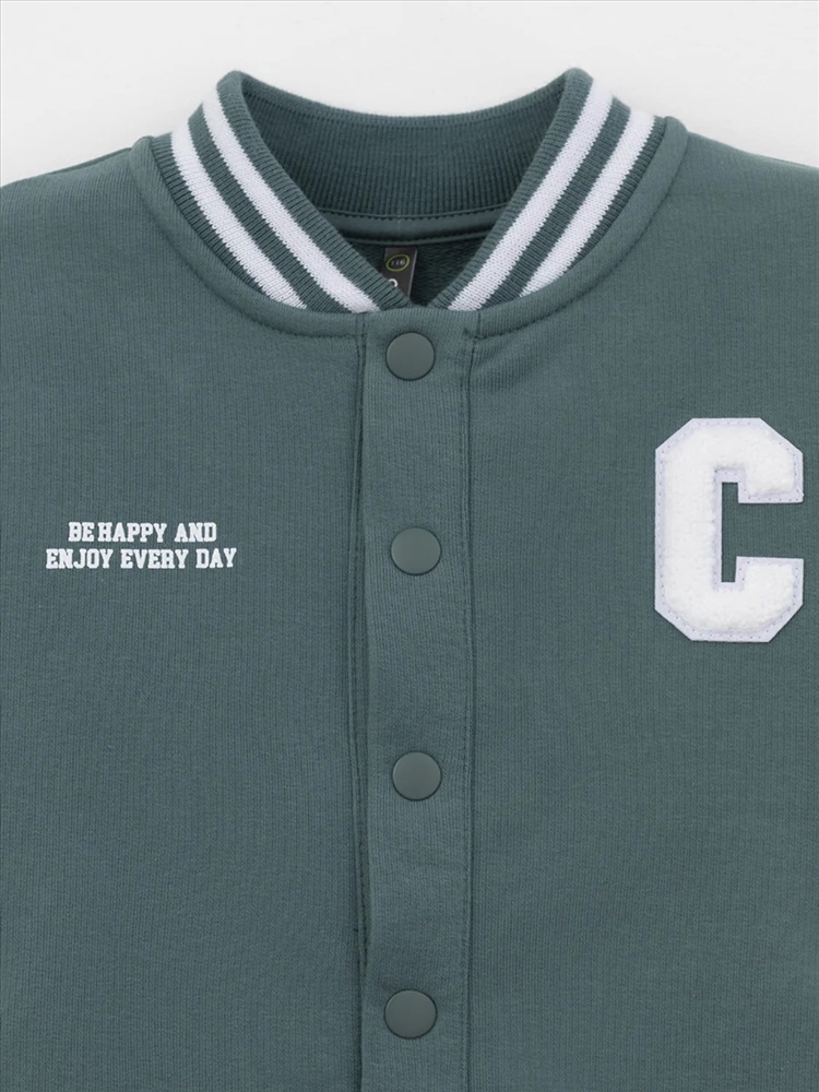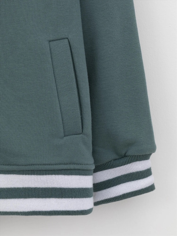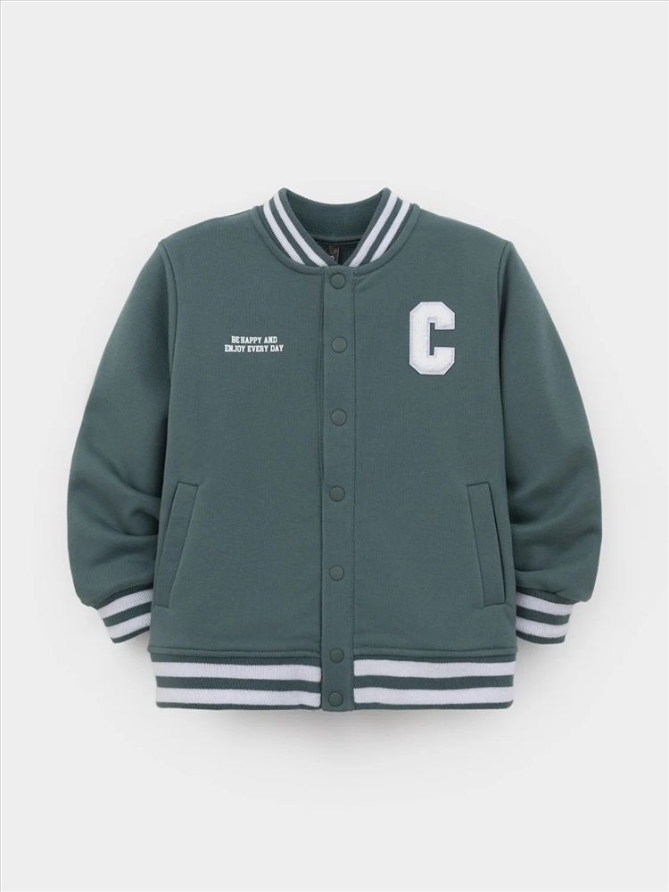 Бомбер с контрастными рукавами для мальчика. Изготовлен из мягкого петельчатого трикотажа. Застёгивается на кнопки. Воротник, манжеты и пояс - вязаные. Спереди карманы с листочкой.