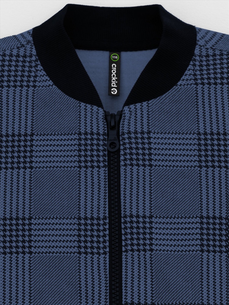 Бомбер для мальчика из мягкого трикотажа. Застёгивается на молнию. Воротник, манжеты и пояс -из эластичного трикотажа в рубчик. Спереди карманы с листочкой.
