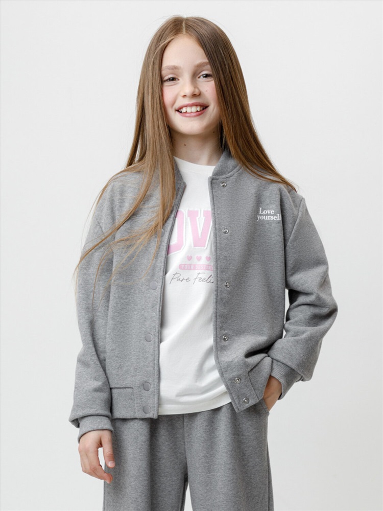 Бомбер для девочки из мягкого трикотажа. В составе 80% натурального хлопка и 20% полиэстера, при этом полиэстер ввязан внутрь по особой технологии и не соприкасается с кожей. Застёгивается на кнопки Воротник, манжеты и пояс выполнены из эластичного полотна. Изделие сохраняет цвет и форму после многократных стирок. Все трикотажные полотна производятся в соответствии с нормами швейцарского сертификата ЭкоТекс.