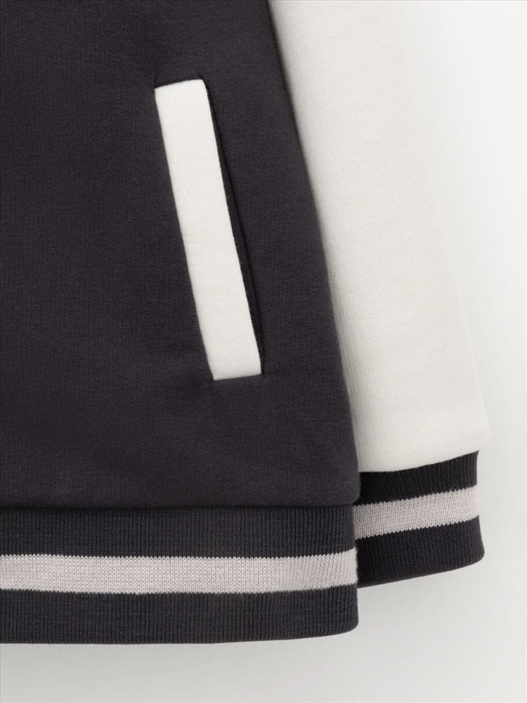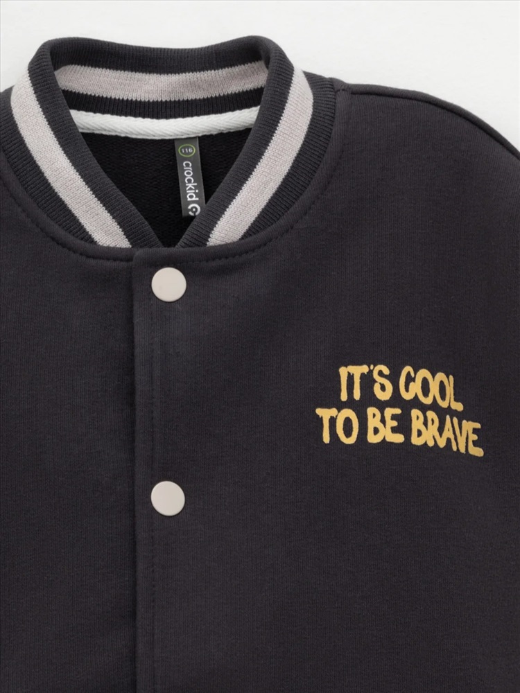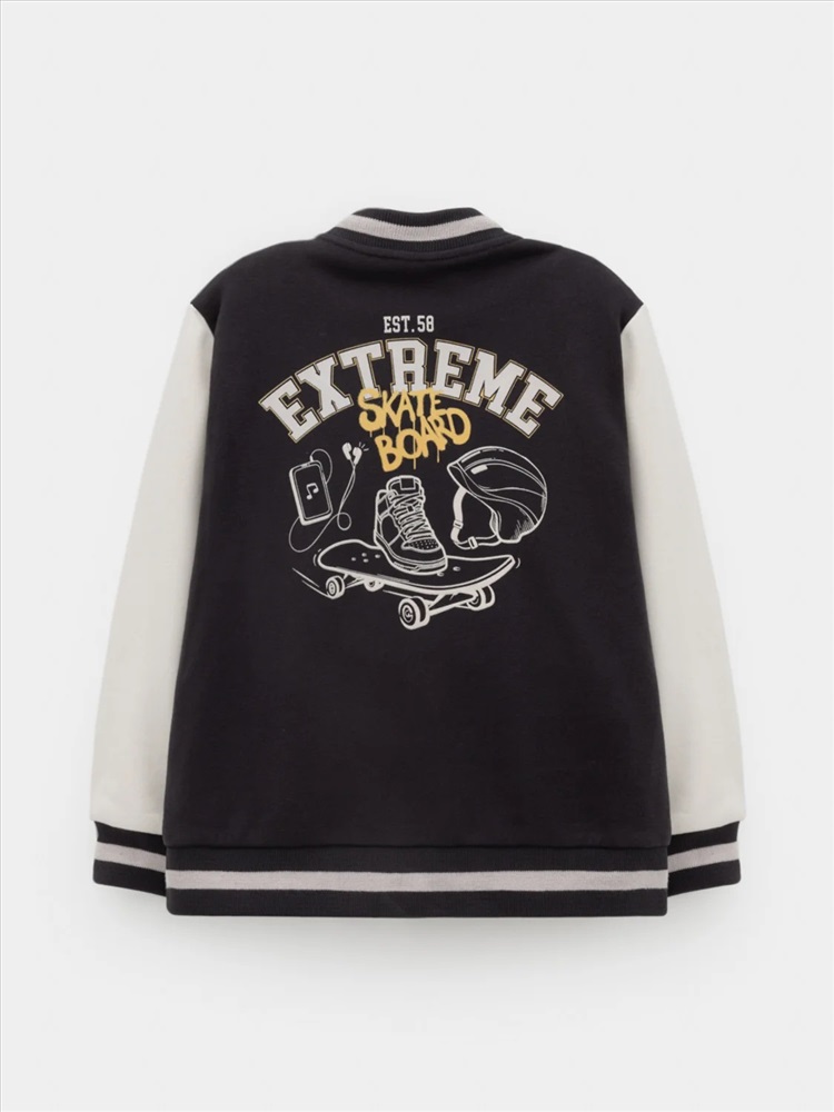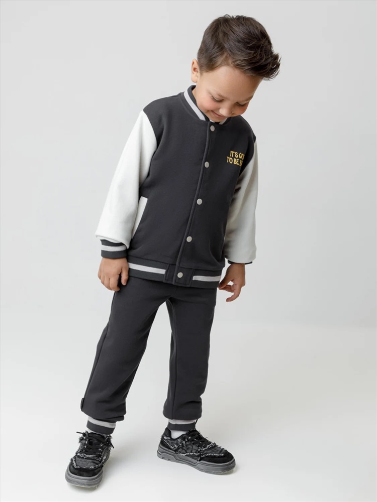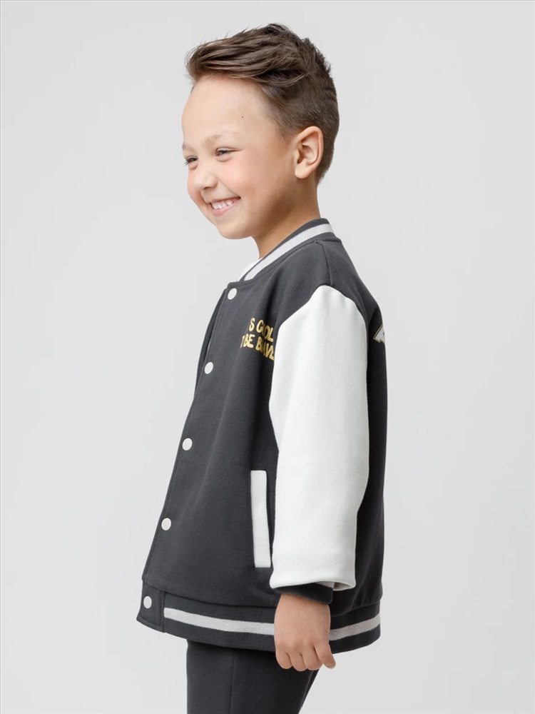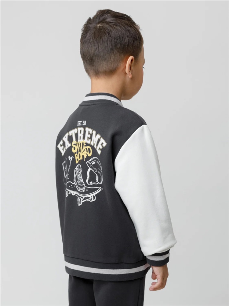 Бомбер для мальчика с контрастными рукавами из мягкого трикотажа. Застёгивается на кнопки. Воротник, манжеты и пояс вязаные. Спереди два кармана. Изделие сохраняет цвет и форму после многократных стирок. Все трикотажные полотна производятся в соответствии с нормами швейцарского сертификата ЭкоТекс.