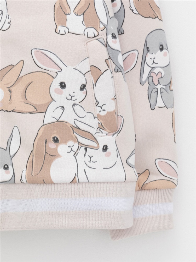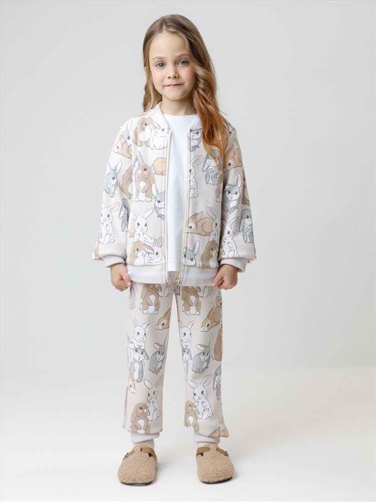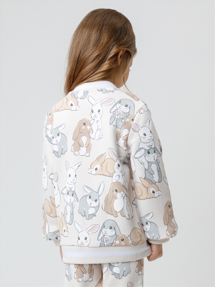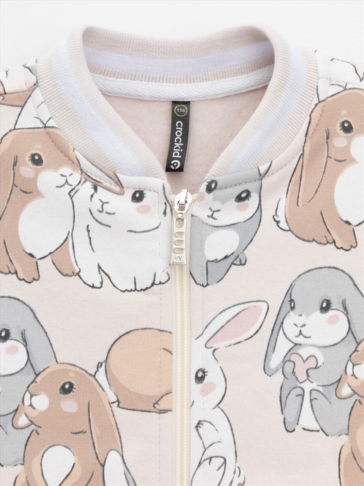 Мягкий бомбер на молнии для девочки. Изготовлен из высококачественного футера с начёсом. Воротник, манжеты и пояс выполнены вязаные. Оригинальный рисунок выполнен из стойких текстильных красителей. Бомбер сохраняет форму и стойкий цвет после многочисленных стирок. Все трикотажные полотна производятся в соответствии с нормами швейцарского сертификата ЭкоТекс.