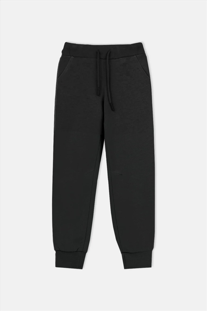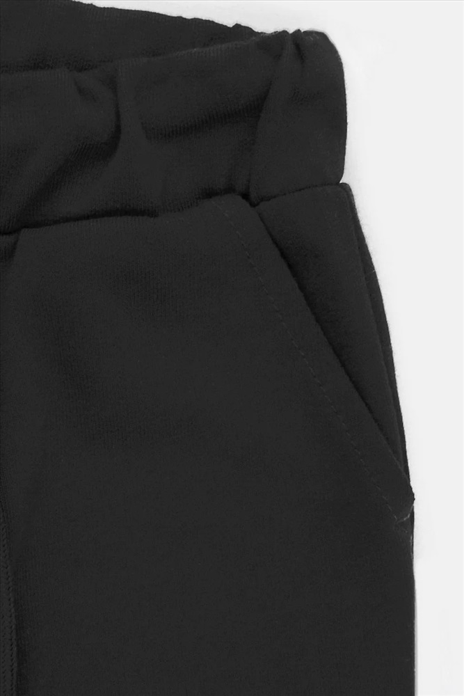 Трикотажные брюки для мальчика из петельчатого футера. Эластичный пояс на резинке регулируется по ширине с помощью шнурка, по бокам два удобных кармана, внизу эластичные манжеты.