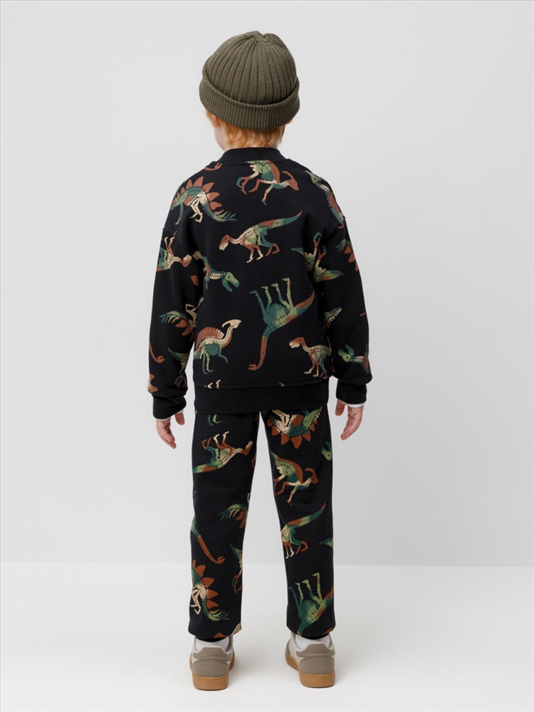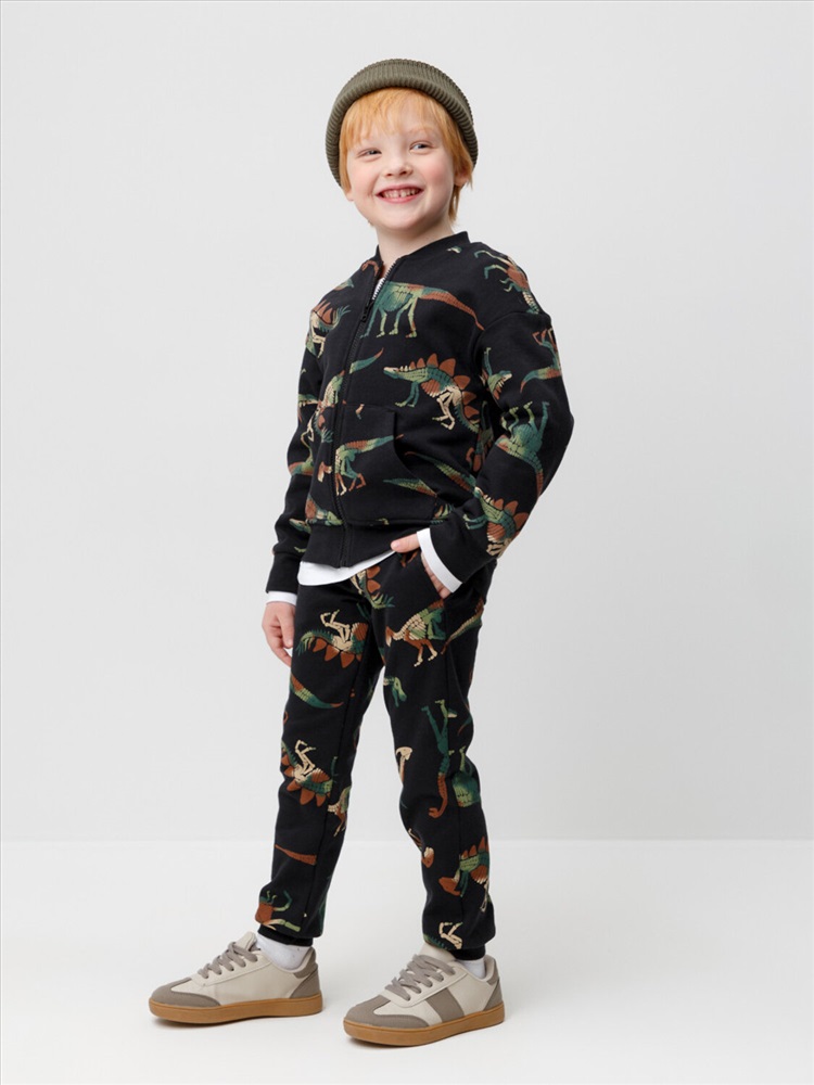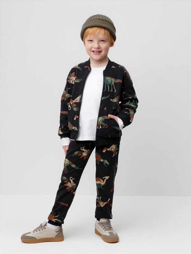 Брюки для мальчика из футера с начёсом, произведённого из натурального хлопка. Эластичный пояс регулируется по ширине с помощью шнурка. У изделия эластичные манжеты и два кармана по бокам. Оригинальная набивка выполнена из стойких текстильных гипоаллергенных красителей. Брюки сохраняют цвет и форму после многократных стирок.