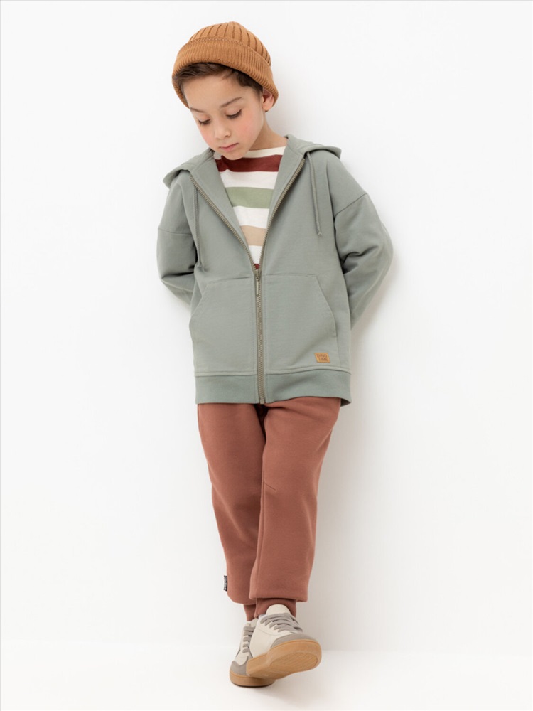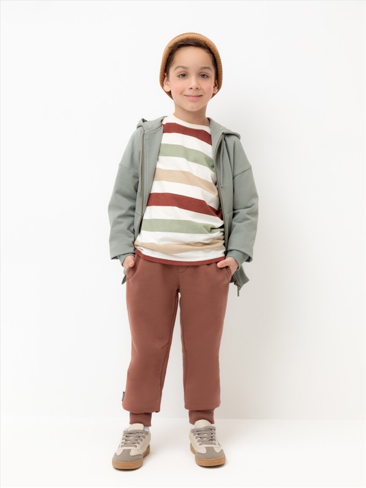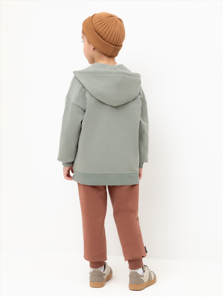 Однотонные брюки для мальчика из футера трехнитки с начесом. Эластичный пояс регулируется по ширине с помощью шнурка. У изделия эластичные манжеты и два кармана по бокам. Брюки сохраняют цвет и форму после многократных стирок.
