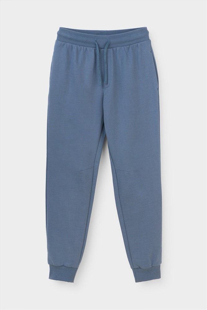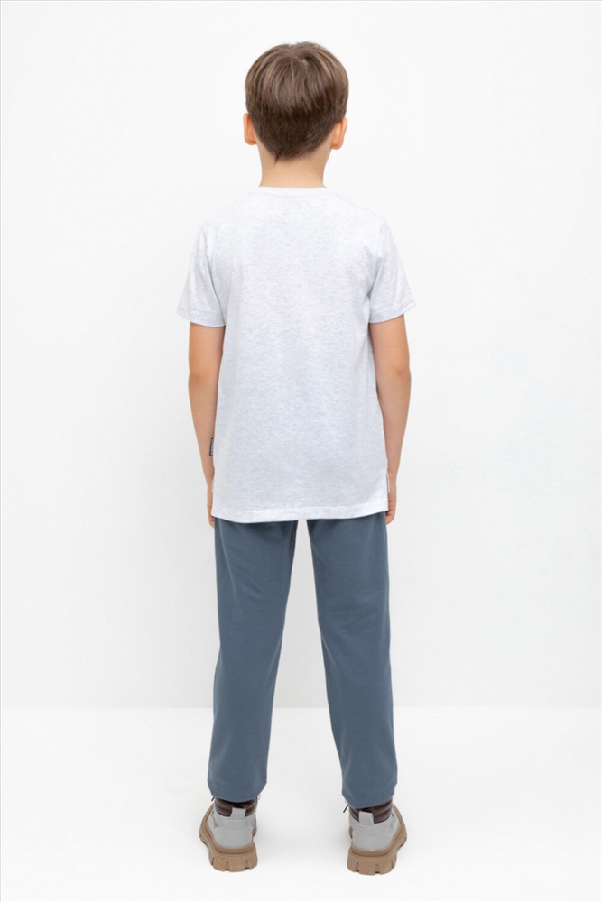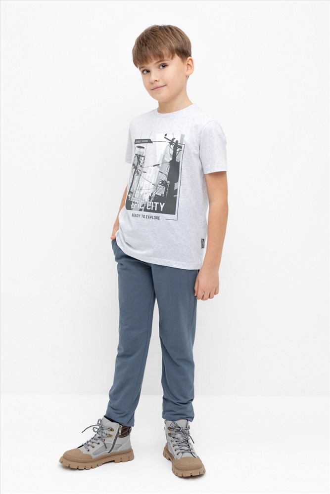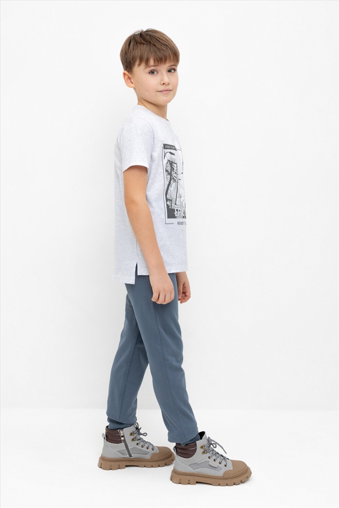 Трикотажные брюки для мальчика из петельчатого футера. Эластичный пояс на резинке регулируется по ширине с помощью шнурка, по бокам два удобных кармана, внизу эластичные манжеты.
