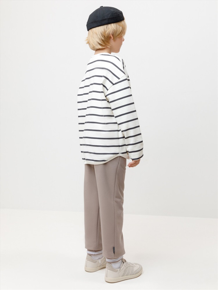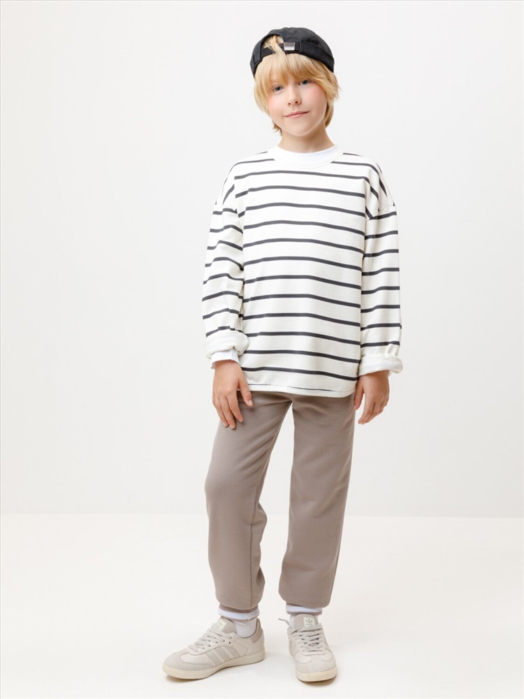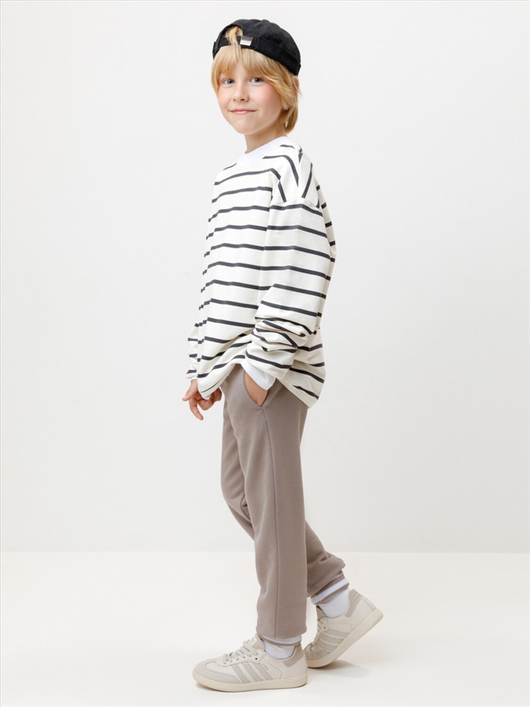 Объёмные брюки для мальчика из мягкого петельчатого трикотажа. В составе 80% натурального хлопка и 20% полиэстера, при этом полиэстер ввязан внутрь по особой технологии и не соприкасается с кожей. Эластичный пояс на резинке регулируется по ширине с помощью шнурка, по бокам два удобных кармана, внизу эластичные манжеты.