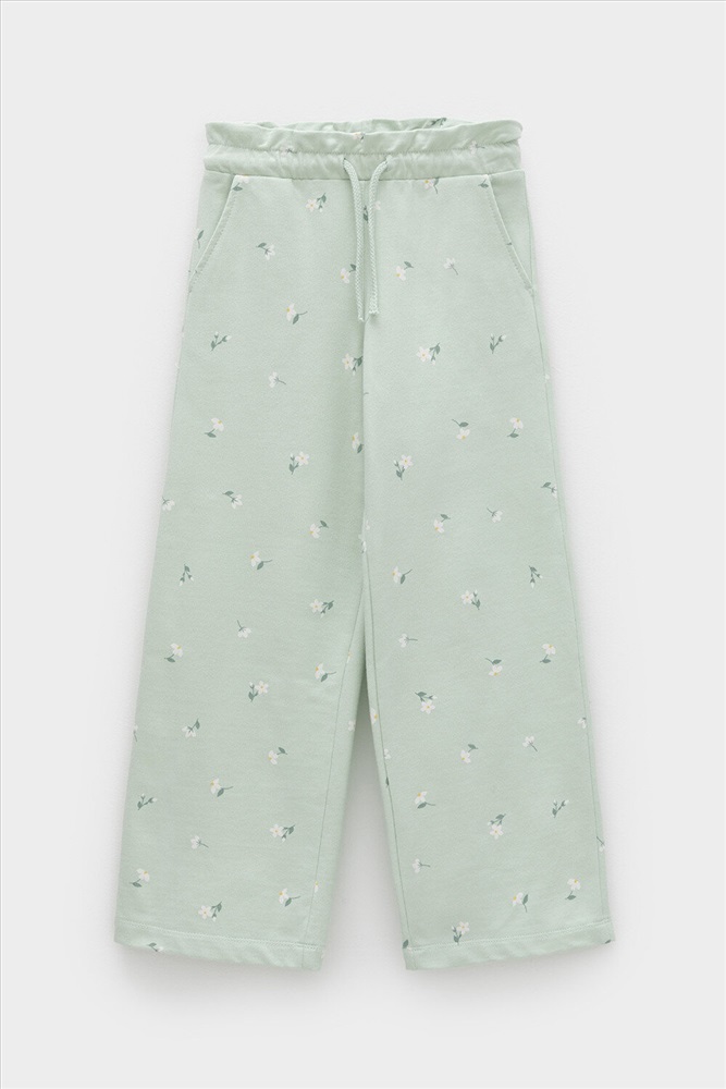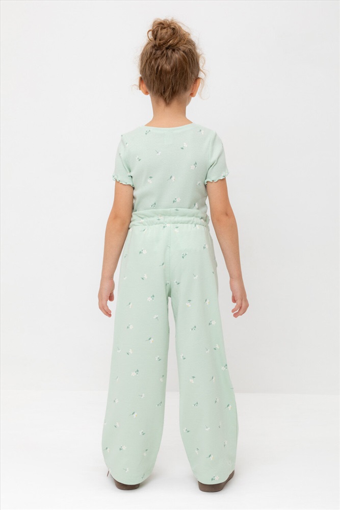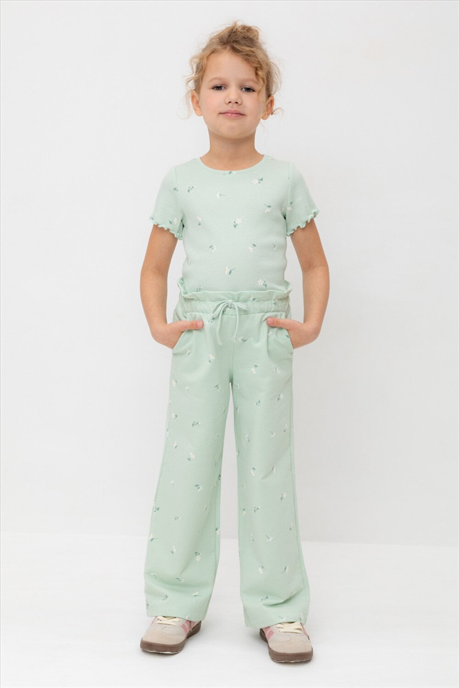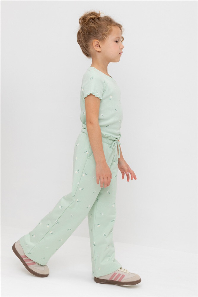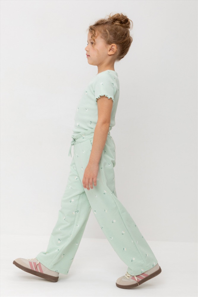 Удобные трикотажные брюки для девочки из высококачественного хлопка. Эластичный пояс регулируется при помощи шнурка. Оригинальная набивка выполнена из стойких текстильных гипоаллергенных красителей. Изделие сохраняет цвет и форму после многократных стирок.