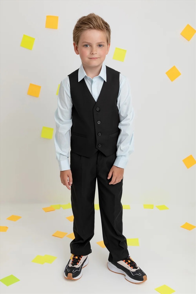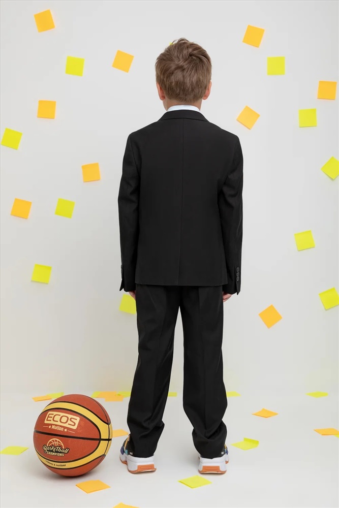 Классические школьные брюки со стрелками для мальчика. Застёгиваются на пуговицу, регулируются по ширине с помощью утяжки на резинку и пуговицы. По бокам и на спинке удобные карманы. По низу брюки обработаны оверлоком.