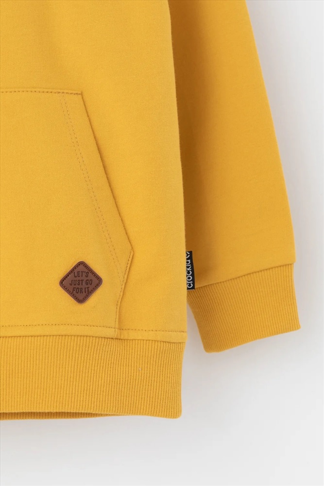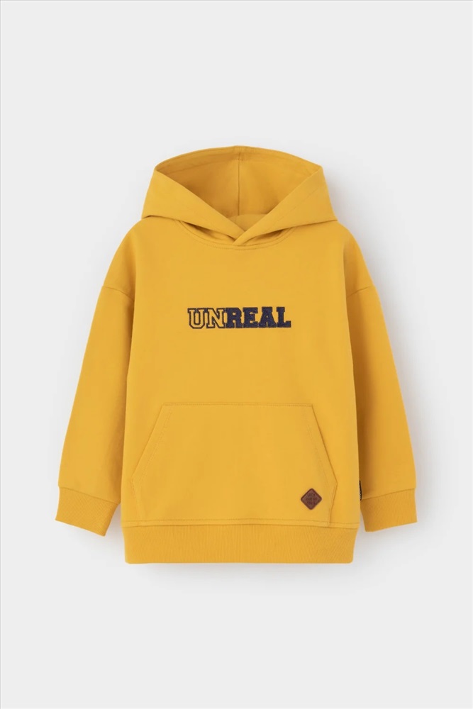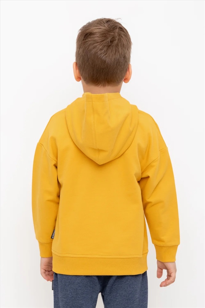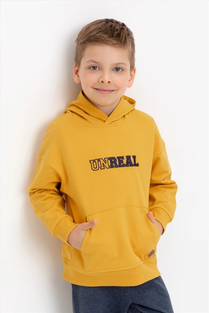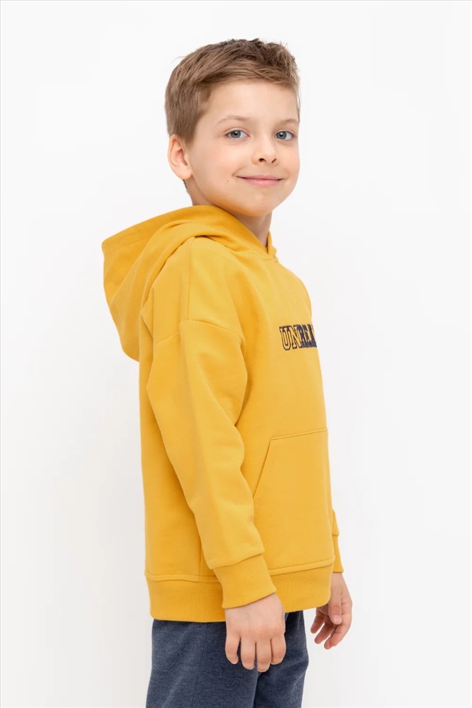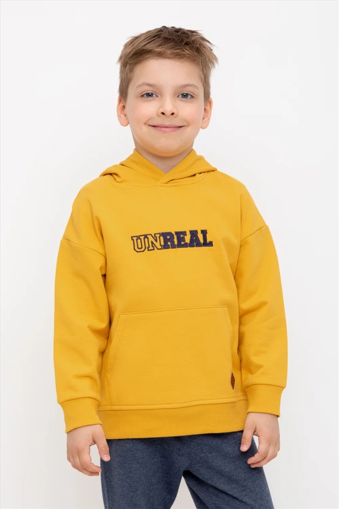 Худи с капюшоном для мальчика из петельчатого футера. Манжеты и пояс выполнены из эластичного полотна. Спереди удобный карман-кенгуру. Спереди вышивка.