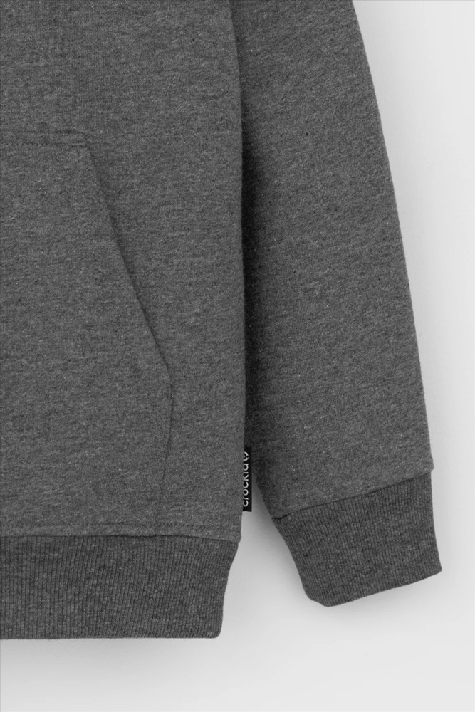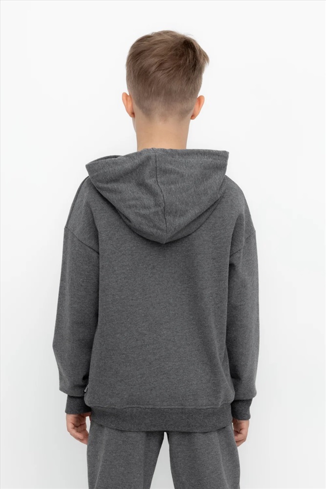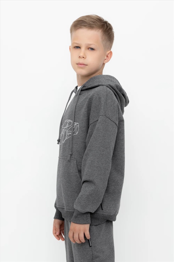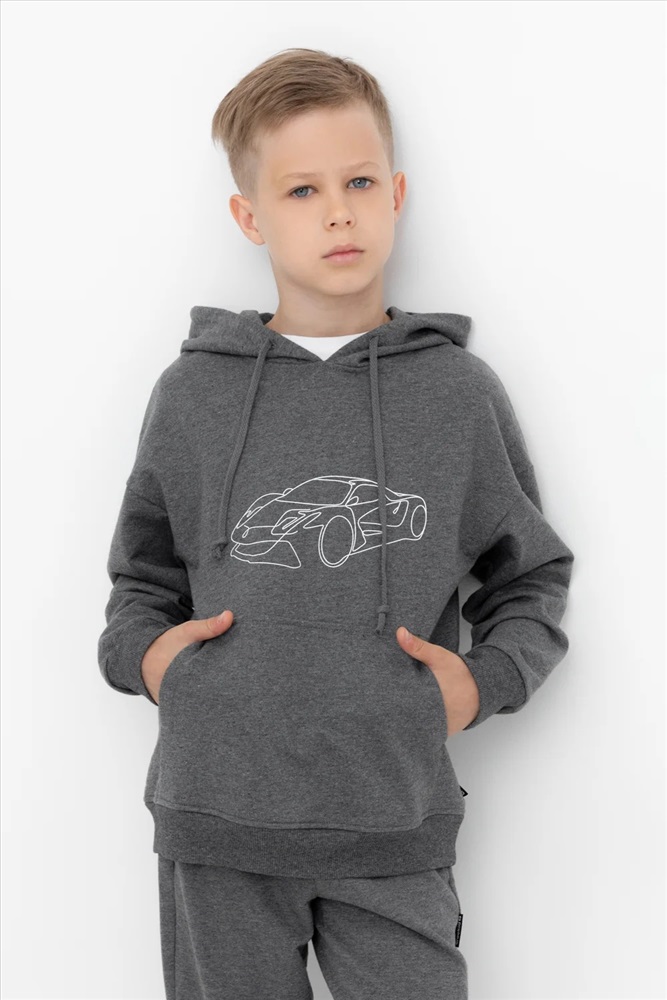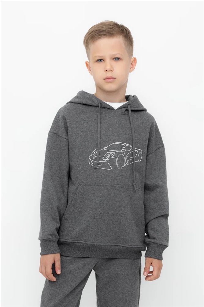 Худи с капюшоном для мальчика из петельчатого футера. Манжеты и пояс выполнены из эластичного полотна. Спереди удобный карман-кенгуру. Украшена принтом.