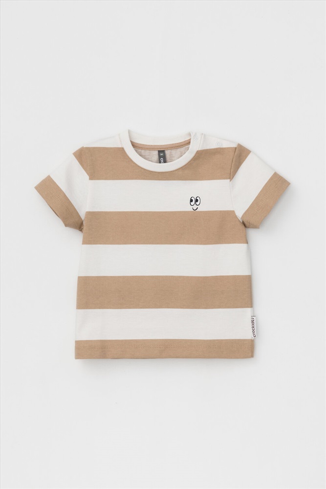 Футболка для мальчика в полоску из высококачественного трикотажного полотна.Оригинальная набивка выполнена из стойких текстильных красителей. Для удобства на плече застежка на кнопки