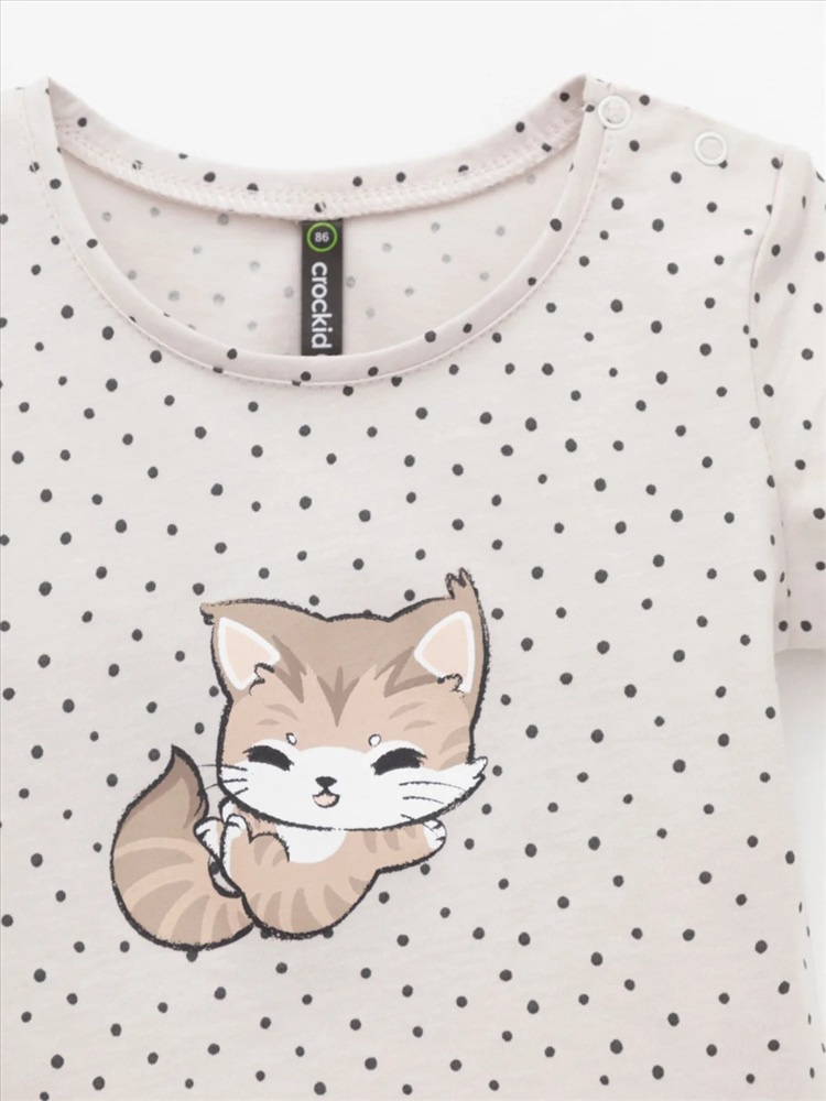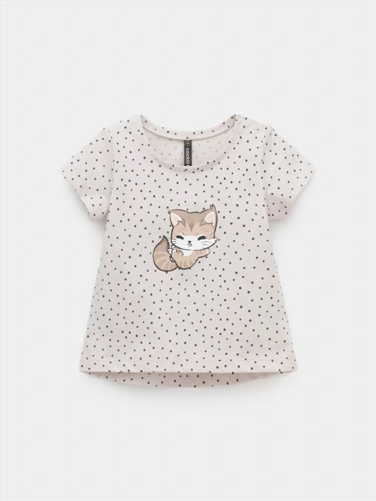 Футболка для девочки из гладкого трикотажа, произведённого из высококачественного натурального хлопка. Застёгивается на плече кнопки. Оригинальный принт выполнен из стойких текстильных гипоаллергенных красителей. Изделие сохраняет цвет и форму после многократных стирок. Все трикотажные полотна производятся в соответствии с нормами швейцарского сертификата ЭкоТекс.