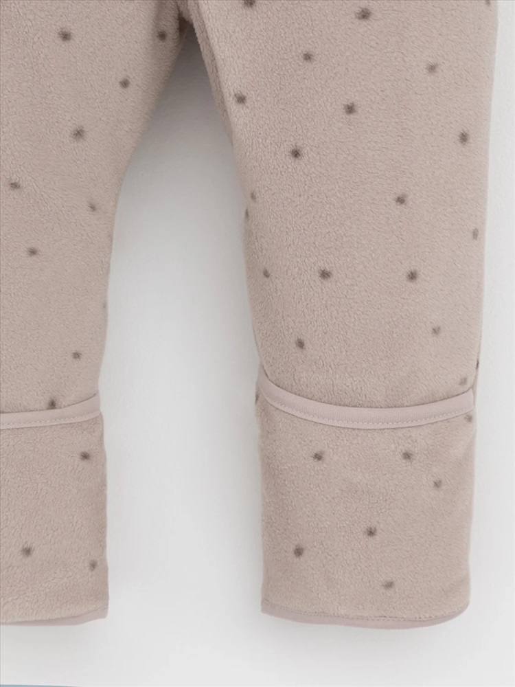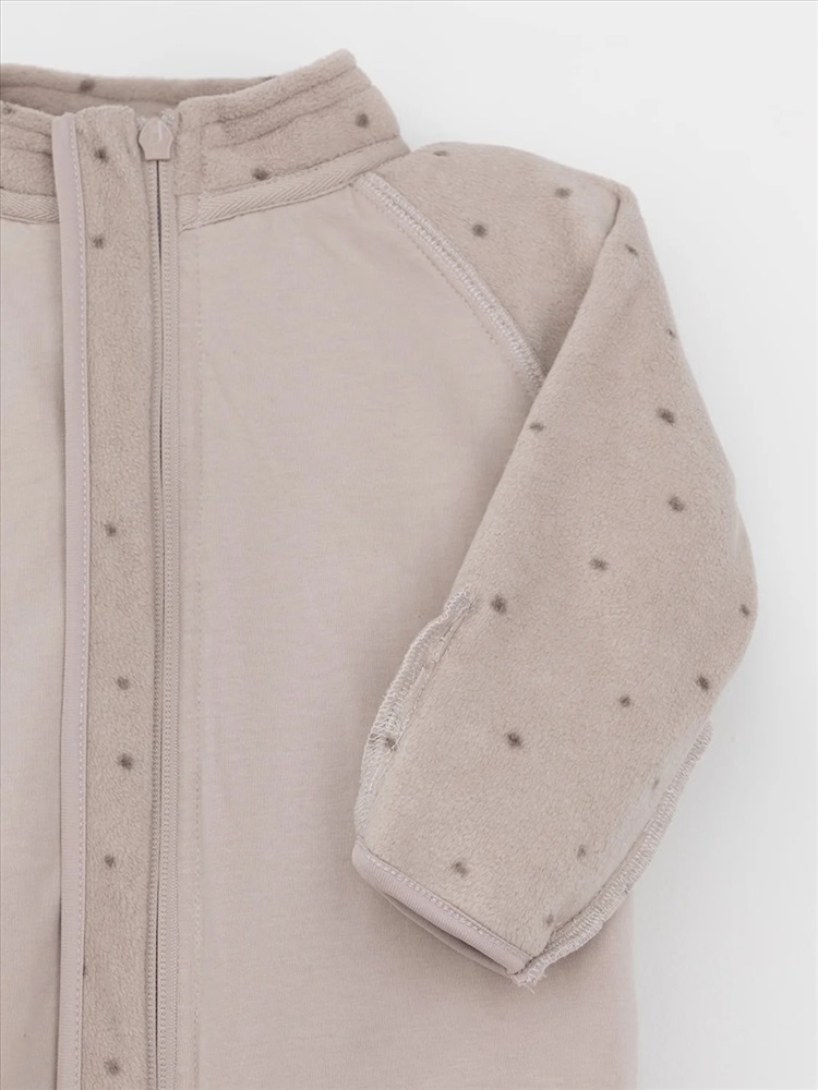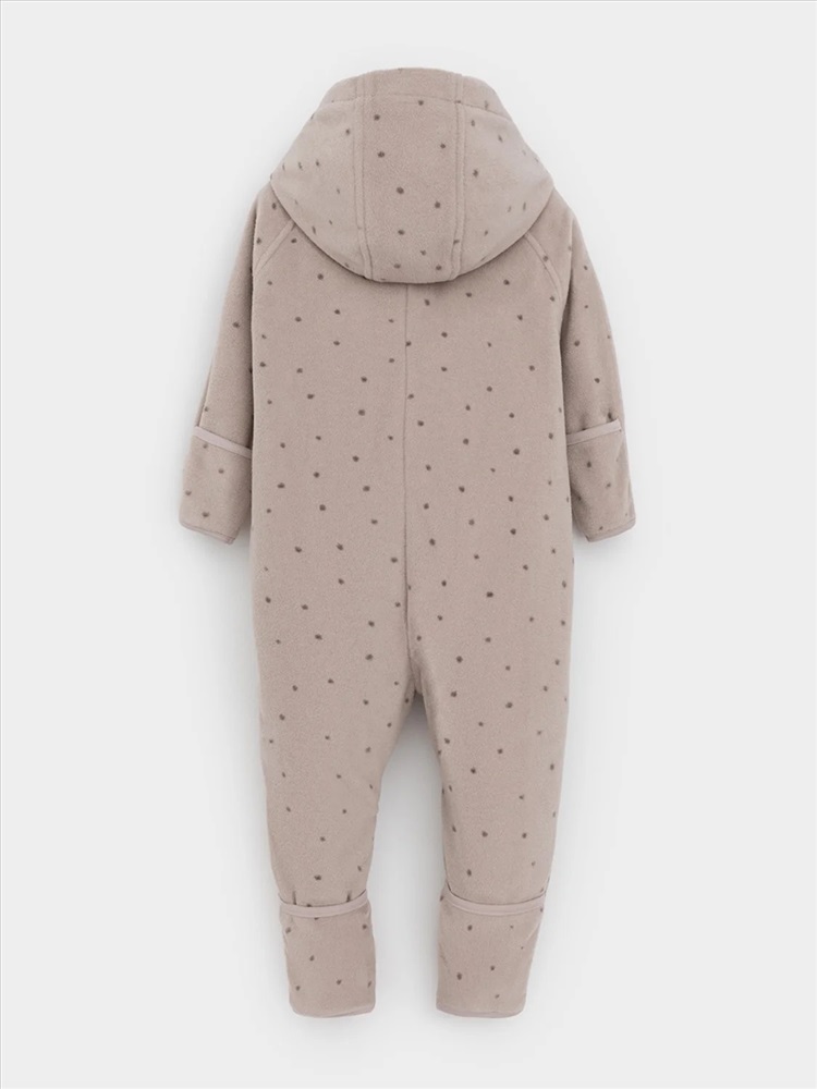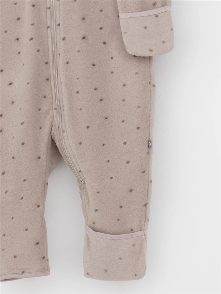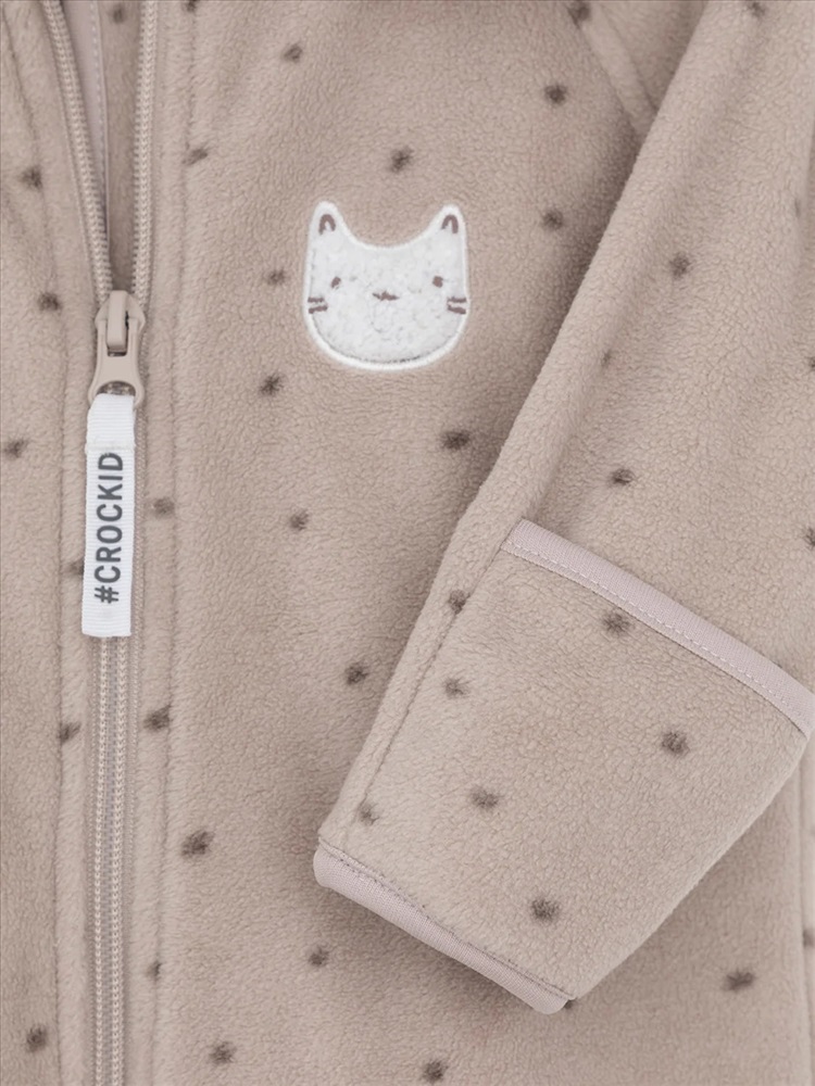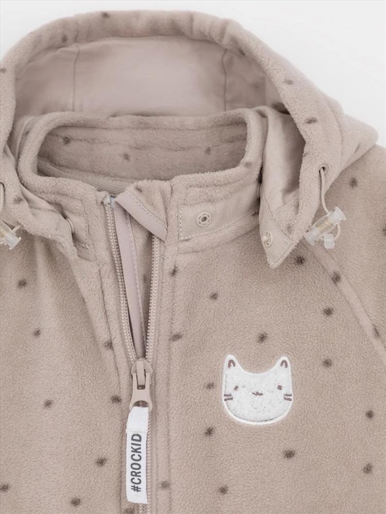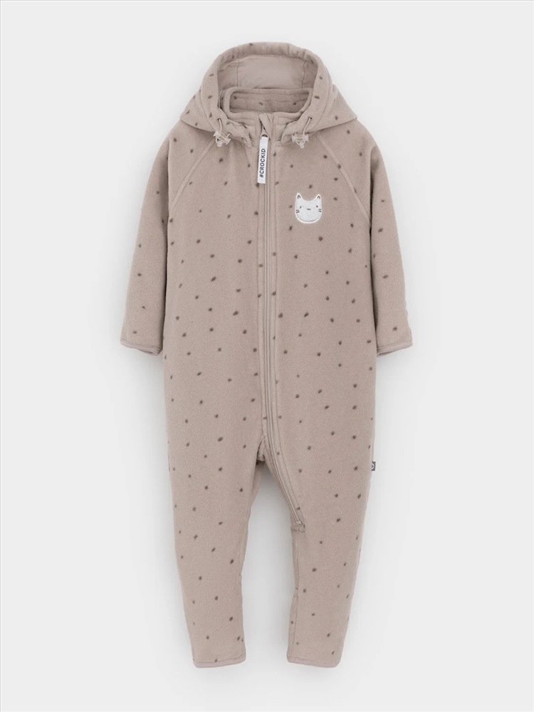 Флисовый комбинезон для девочки со съёмным капюшоном. Капюшон регулируется по ширине с помощью эластичной утяжки со стопперами. Подклад выполнен из гладкого трикотажа супрем, произведённого из высококачественного натурального хлопка. Застёгивается на удлинённую молнию с мягкой защитой шеи и подбородка. В размерах 62, 68 и 74 на рукавах и ножках есть отвороты. Украшен вышивкой. Оригинальная набивка выполнена из стойких, гипоаллергенных текстильных красителей. Комбинезон сохраняет цвет и форму после многократных стирок.