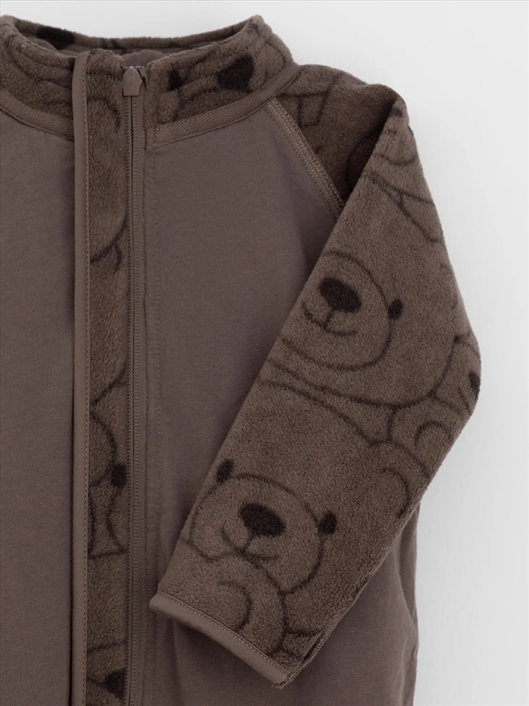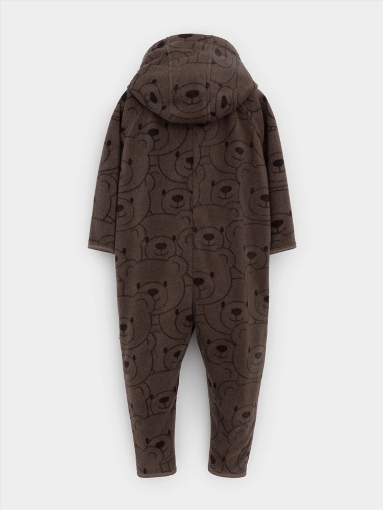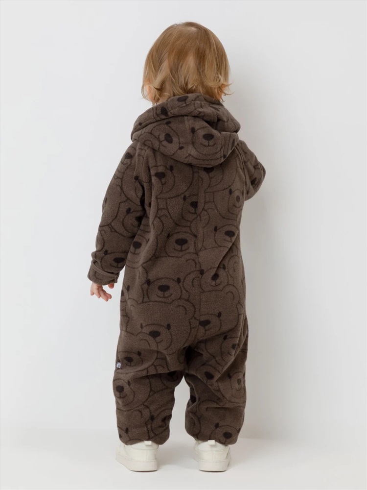 Флисовый комбинезон для мальчика со съёмным капюшоном. Капюшон регулируется по ширине с помощью эластичной утяжки со стопперами. Подклад выполнен из гладкого трикотажа супрем, произведённого из высококачественного натурального хлопка. Застёгивается на удлинённую молнию с мягкой защитой шеи и подбородка. В размерах 62, 68 и 74 на рукавах и ножках есть отвороты. Оригинальная набивка выполнена из стойких гипоаллергенных текстильных красителей. Комбинезон сохраняет цвет и форму после многократных стирок.