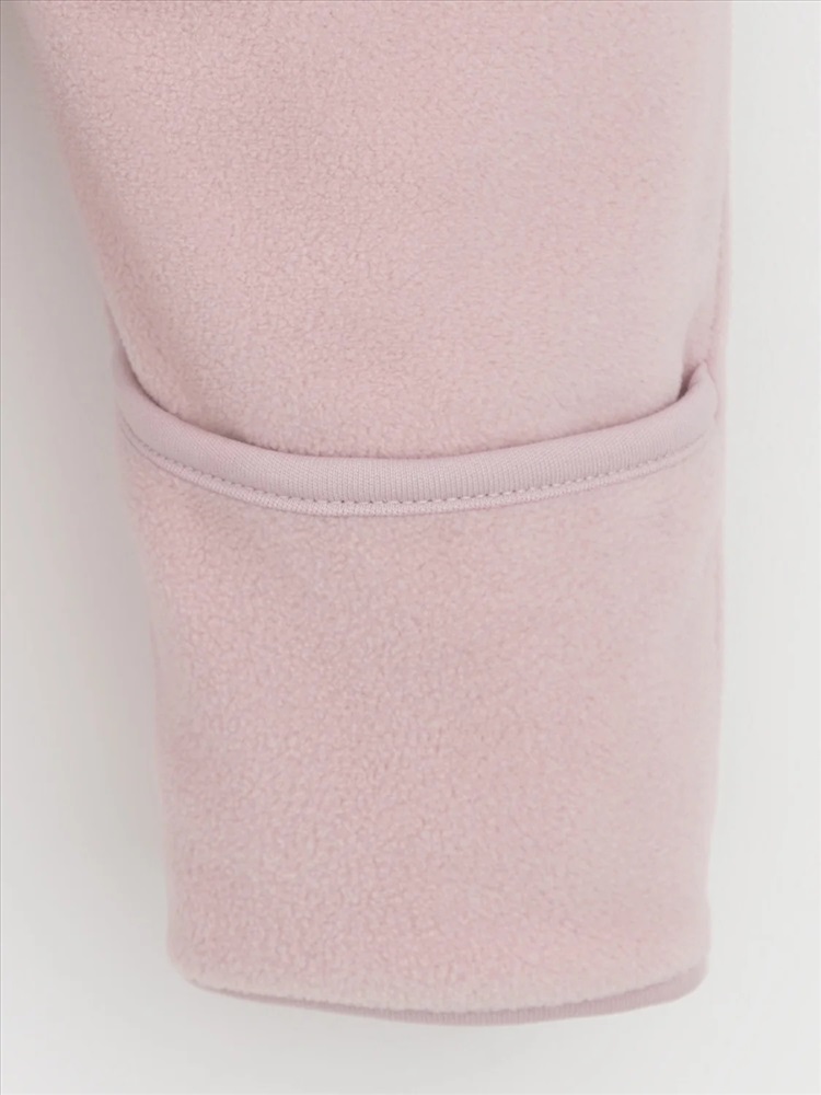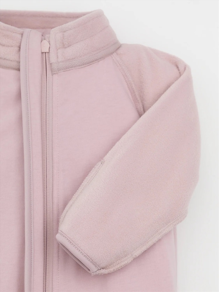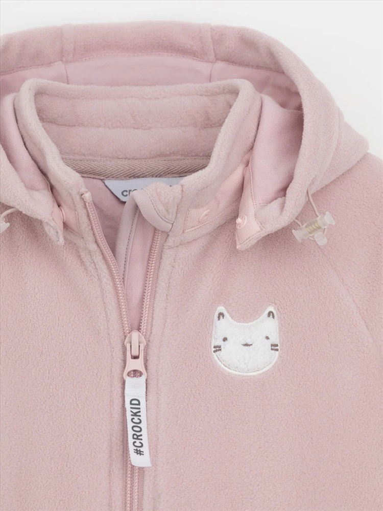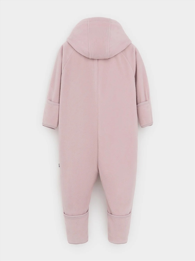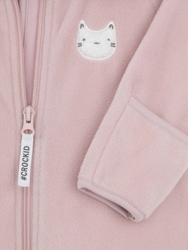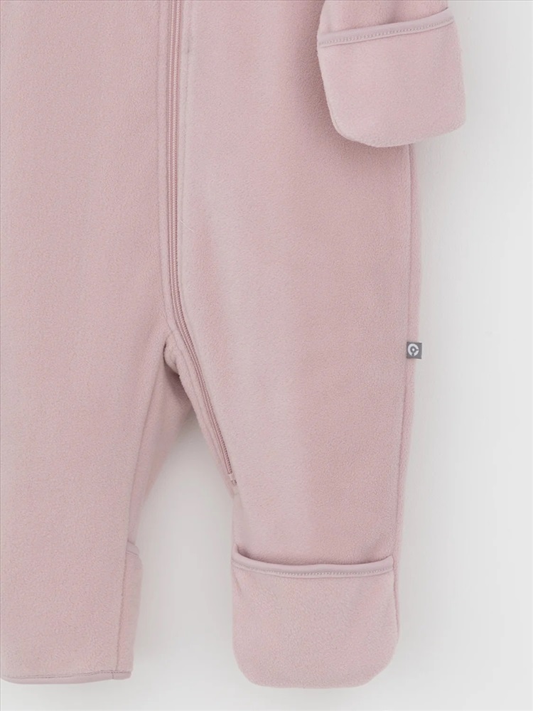 Флисовый комбинезон для девочки со съёмным капюшоном. Капюшон регулируется по ширине с помощью эластичной утяжки со стопперами. Подклад выполнен из гладкого трикотажа супрем, произведённого из высококачественного натурального хлопка. Застёгивается на удлинённую молнию с мягкой защитой шеи и подбородка. В размерах 62, 68 и 74 на рукавах и ножках есть отвороты. Украшен вышивкой. Комбинезон сохраняет цвет и форму после многократных стирок.