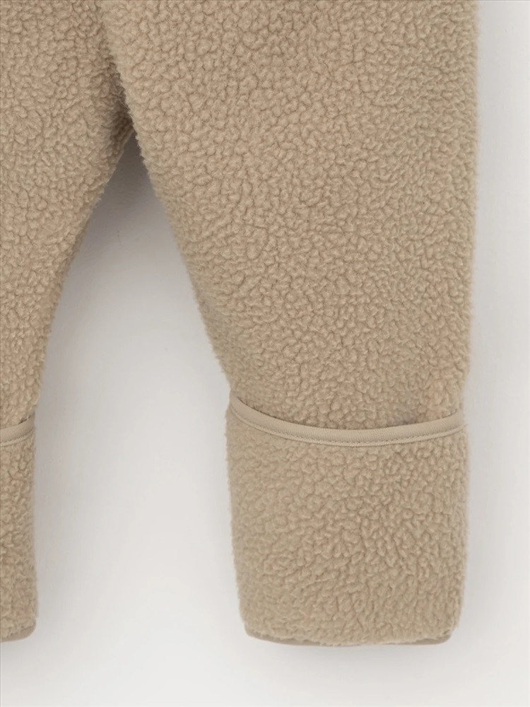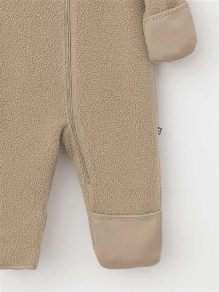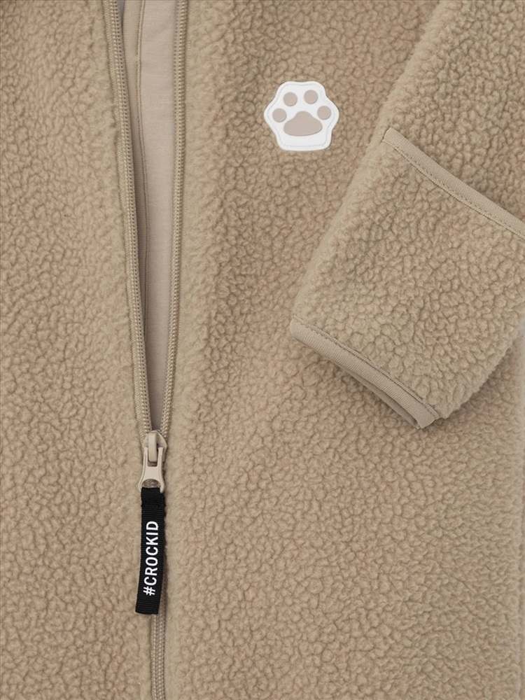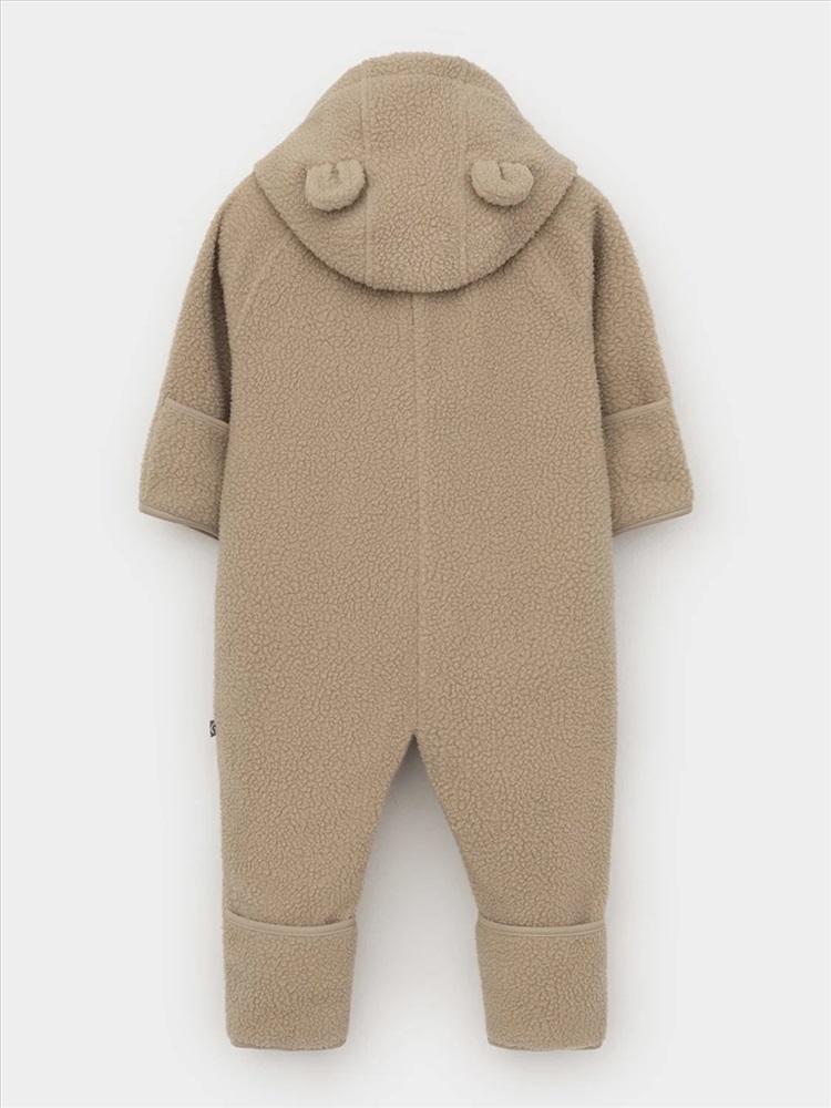 Флисовый комбинезон для девочки со съёмным капюшоном. Капюшон регулируется по ширине с помощью эластичной утяжки со стопперами. Подклад выполнен из гладкого трикотажа супрем, произведённого из высококачественного натурального хлопка. Застёгивается на удлинённую молнию с мягкой защитой шеи и подбородка. В размерах 62, 68 и 74 на рукавах и ножках есть отвороты. Украшен декоративными ушками и нашивкой. Комбинезон сохраняет цвет и форму после многократных стирок.