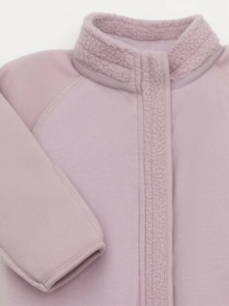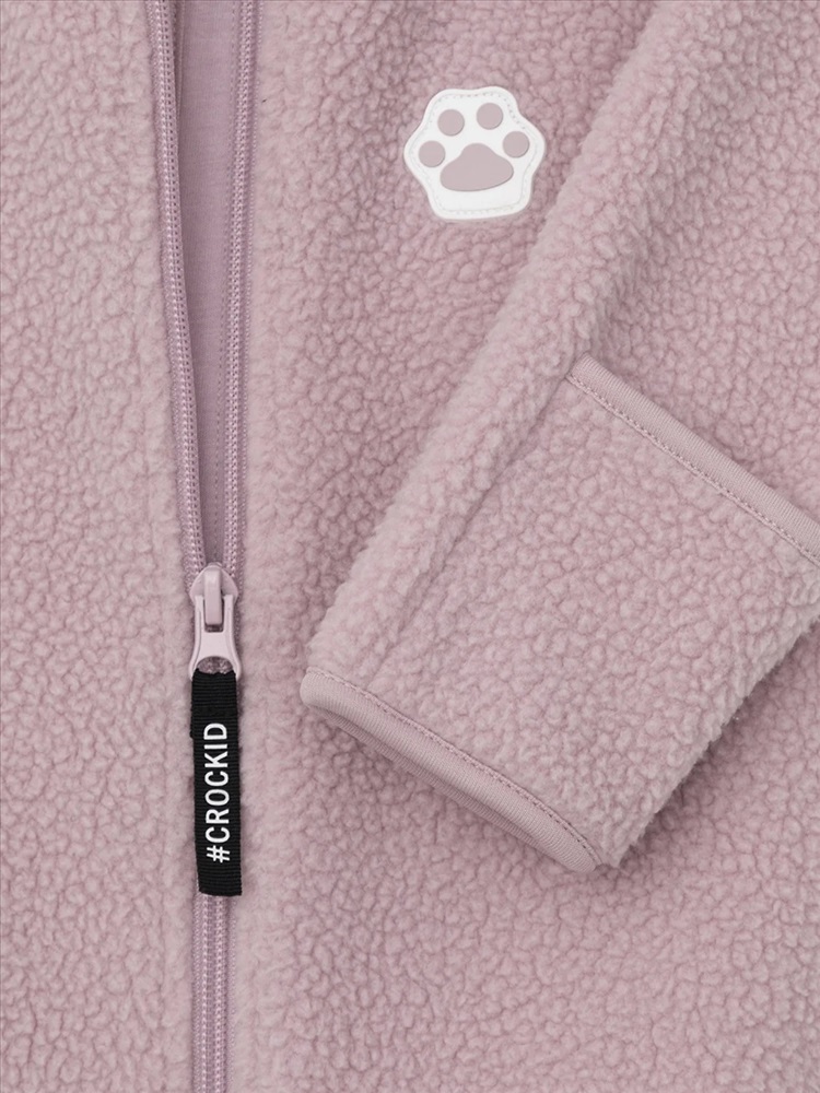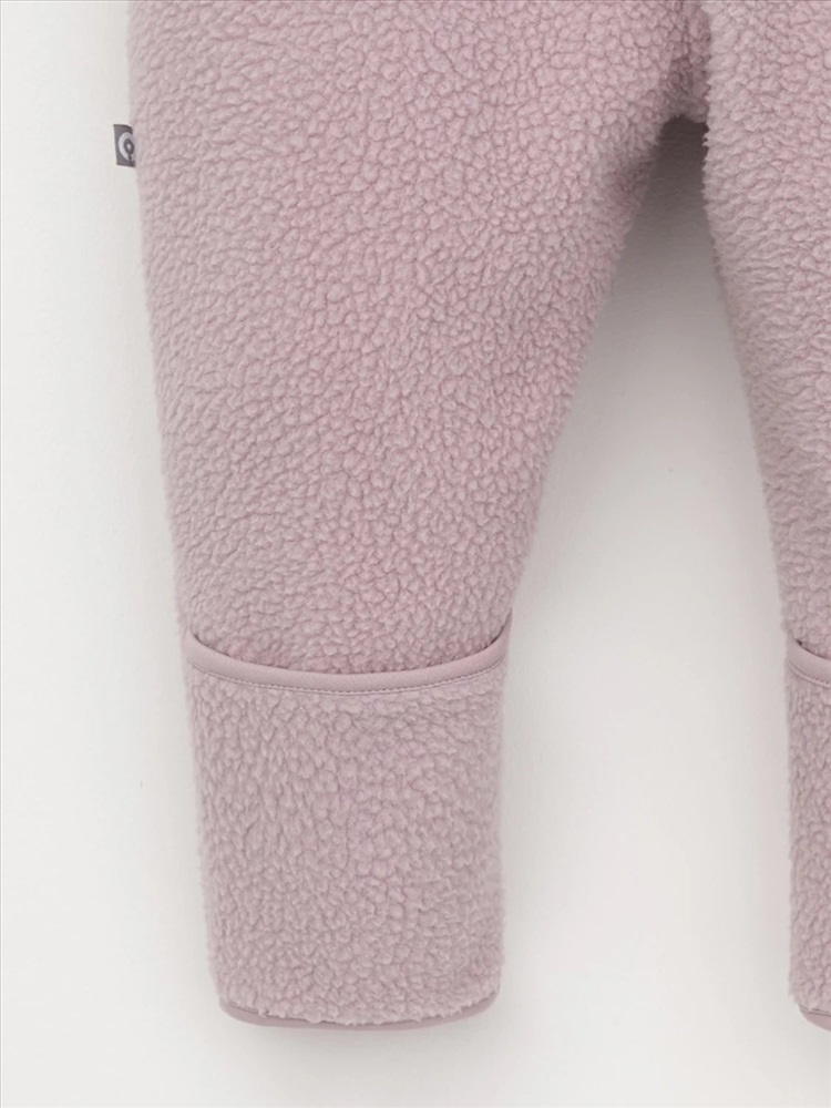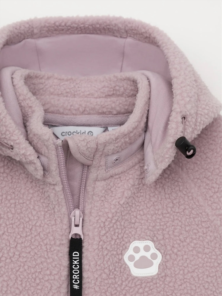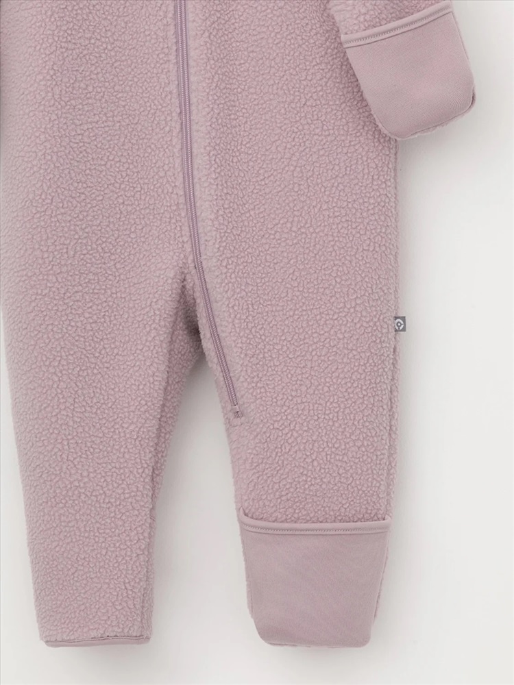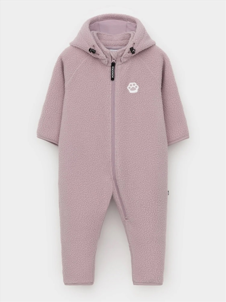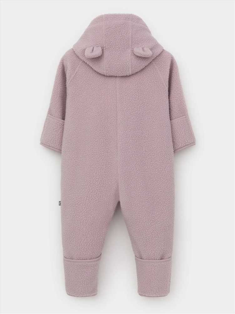 Флисовый комбинезон для девочки со съёмным капюшоном. Капюшон регулируется по ширине с помощью эластичной утяжки со стопперами. Подклад выполнен из гладкого трикотажа супрем, произведённого из высококачественного натурального хлопка. Застёгивается на удлинённую молнию с мягкой защитой шеи и подбородка. В размерах 62, 68 и 74 на рукавах и ножках есть отвороты. Украшен декоративными ушками и нашивкой. Комбинезон сохраняет цвет и форму после многократных стирок.