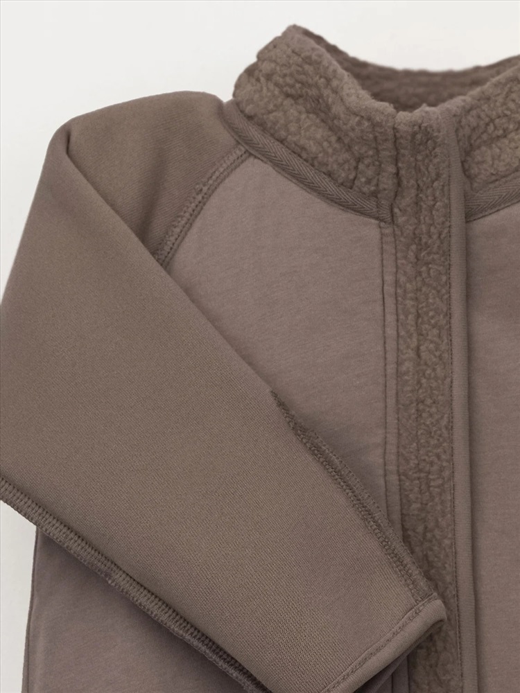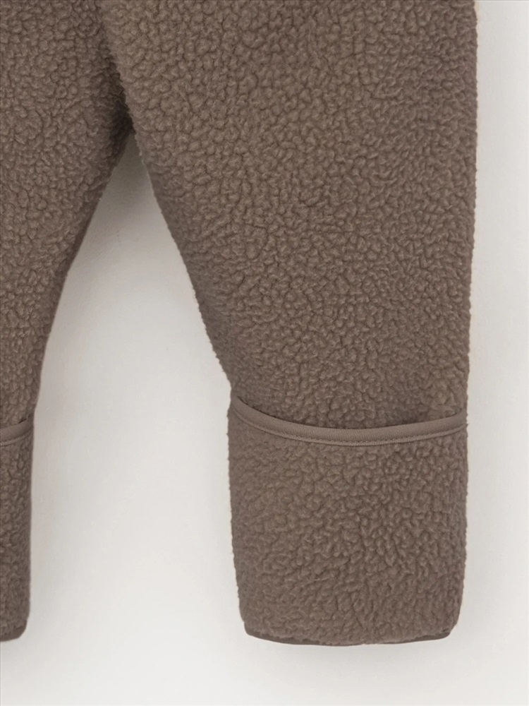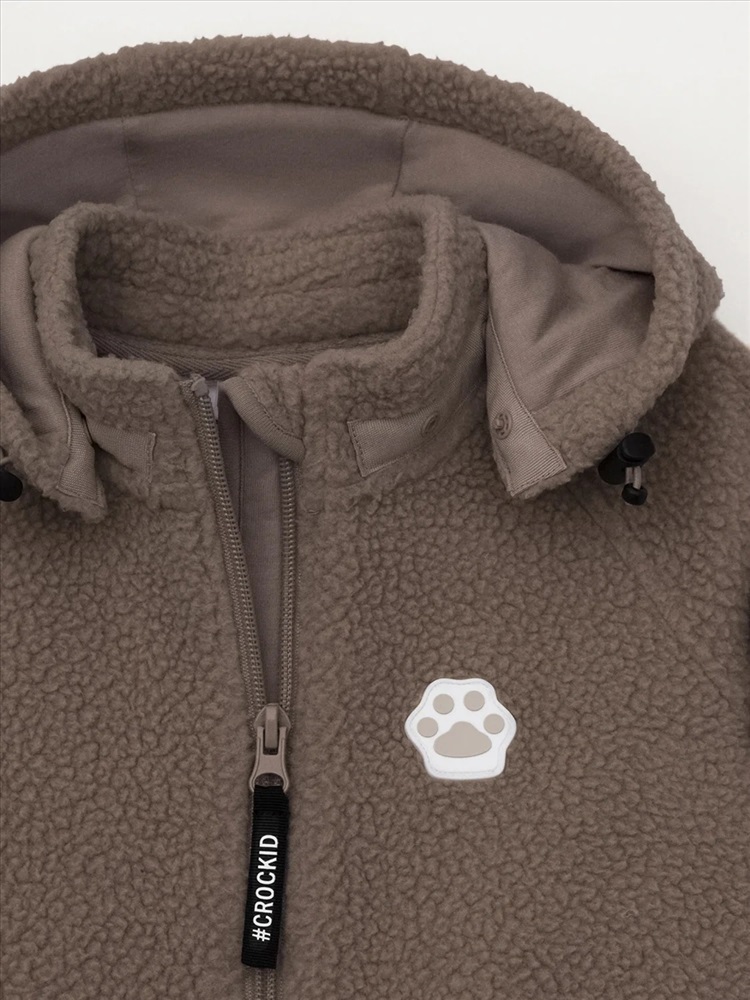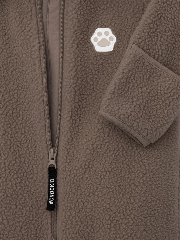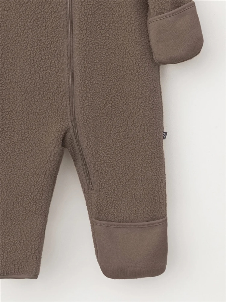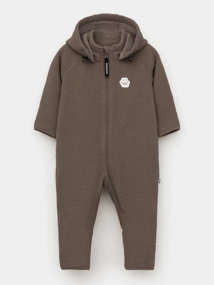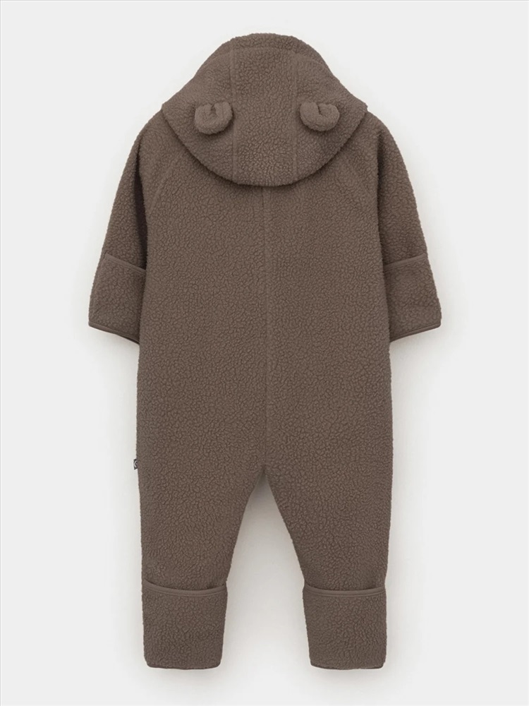 Флисовый комбинезон для мальчика со съёмным капюшоном. Капюшон регулируется по ширине с помощью эластичной утяжки со стопперами. Подклад выполнен из гладкого трикотажа супрем, произведённого из высококачественного натурального хлопка. Застёгивается на удлинённую молнию с мягкой защитой шеи и подбородка. В размерах 62, 68 и 74 на рукавах и ножках есть отвороты. Украшен декоративными ушками и нашивкой. Комбинезон сохраняет цвет и форму после многократных стирок.