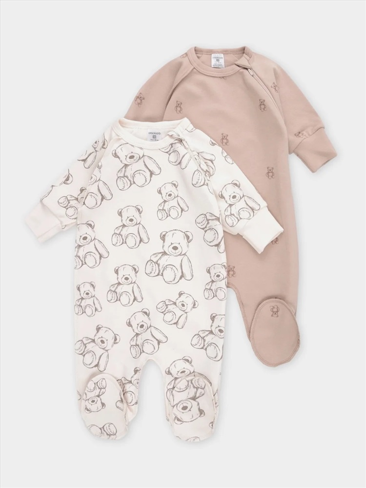 Комбинезоны для новорождённых из мягкого эластичного трикотажа интерлок, произведённого из натурального хлопка. В упаковке 2 штуки. Застёгиваются сбоку на молнию с мягкой защитой шеи и подбородка. Длинные рукава-реглан оканчиваются манжетами. Оригинальная набивка выполнена из стойких гипоаллергенных текстильных красителей. Все трикотажные полотна производятся в соответствии с нормами швейцарского сертификата ЭкоТекс.