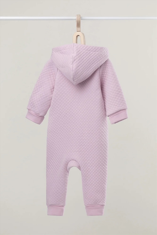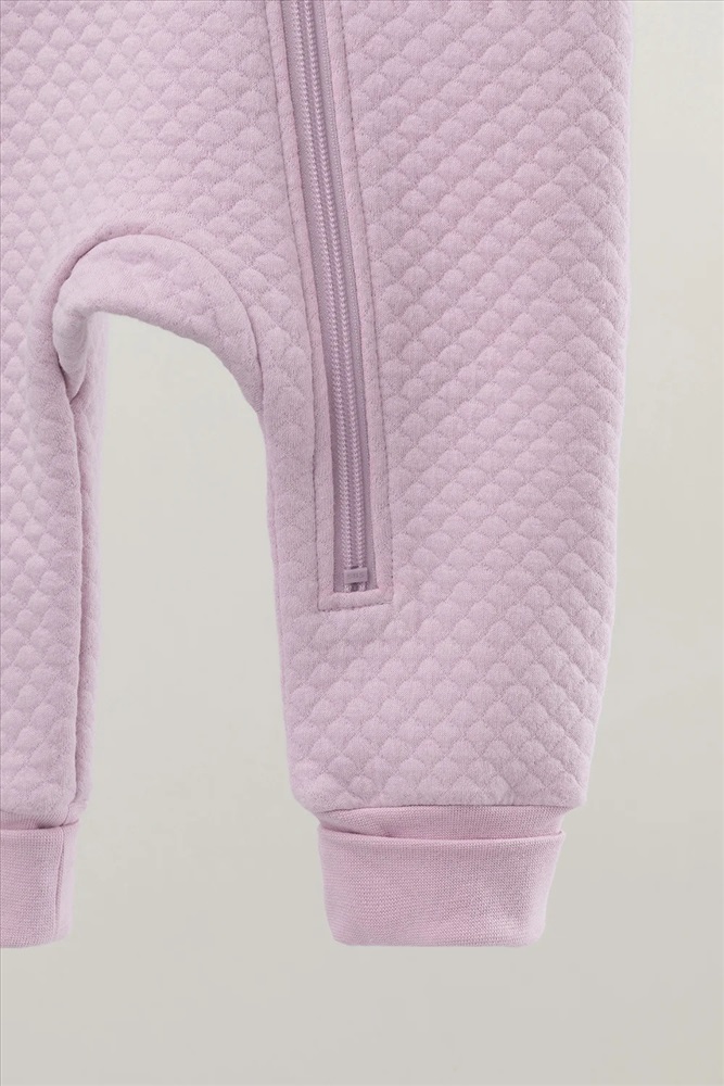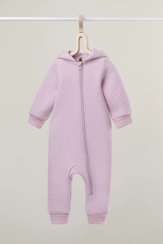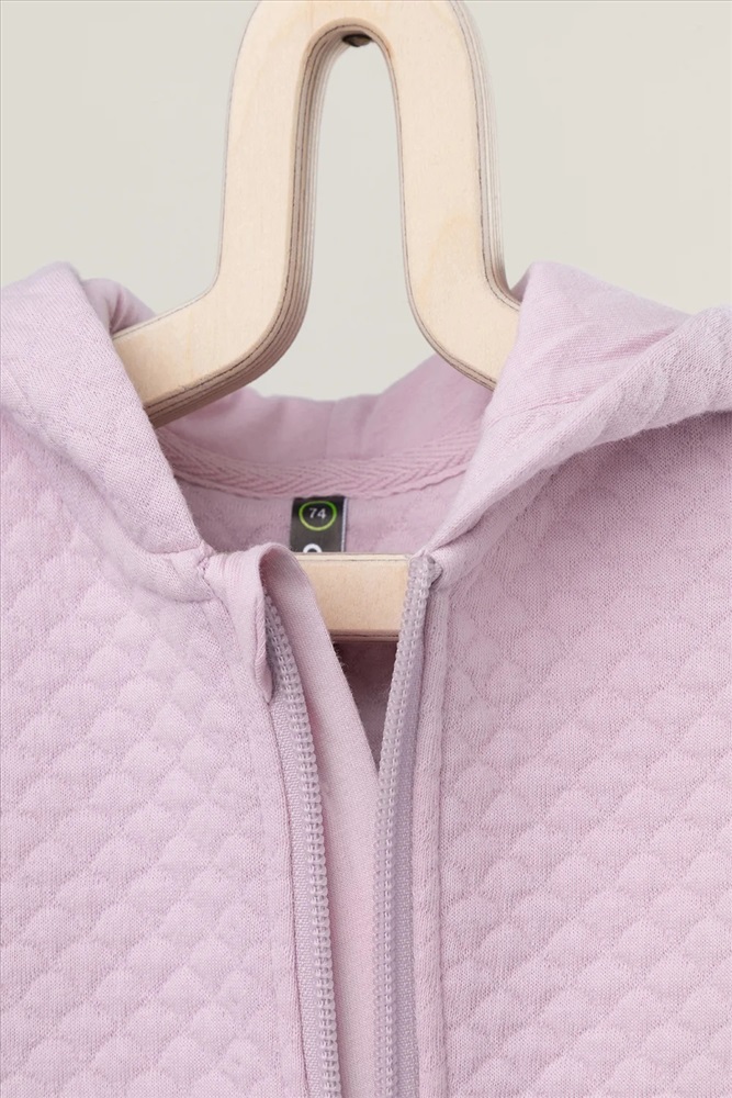 Тёплый комбинезон из капитония для новорождённых. Капитоний – это стёганое трикотажное полотно с утеплителем из полиэстеровой нити. Изделие застёгивается на молнию и имеет капюшон с подкладом из супрема. На рукавах и ножках эластичные манжеты из рибаны. Все трикотажные полотна производятся в соответствии с нормами Швейцарского сертификата ЭкоТекс.