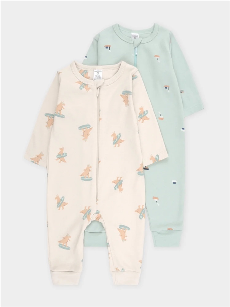 Комбинезоны для новорождённых из мягкого эластичного трикотажа интерлок, произведённого из натурального хлопка. В упаковке 2 штуки. Застёгиваются спереди на молнию, предусмотрена защита подбородка. Оригинальная набивка выполнена из стойких гипоаллергенных текстильных красителей. Все трикотажные полотна производятся в соответствии с нормами Швейцарского сертификата ЭкоТекс.