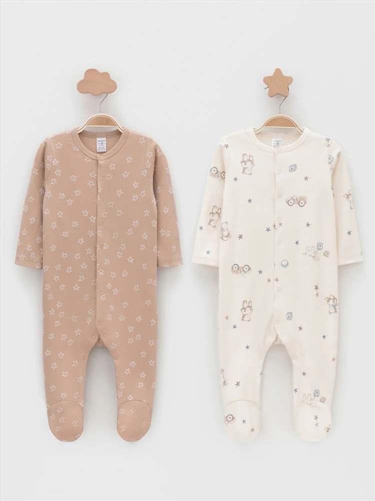 Комбинезоны для новорождённых из мягкого эластичного трикотажа, произведённого из натурального хлопка. В упаковке 2 штуки. Застёгиваются спереди на кнопки. В размере 56 на рукавах предусмотрены антицарапки, швы выполнены наружу. Оригинальная набивка выполнена из стойких гипоаллергенных текстильных красителей. Все трикотажные полотна производятся в соответствии с нормами швейцарского сертификата ЭкоТекс.