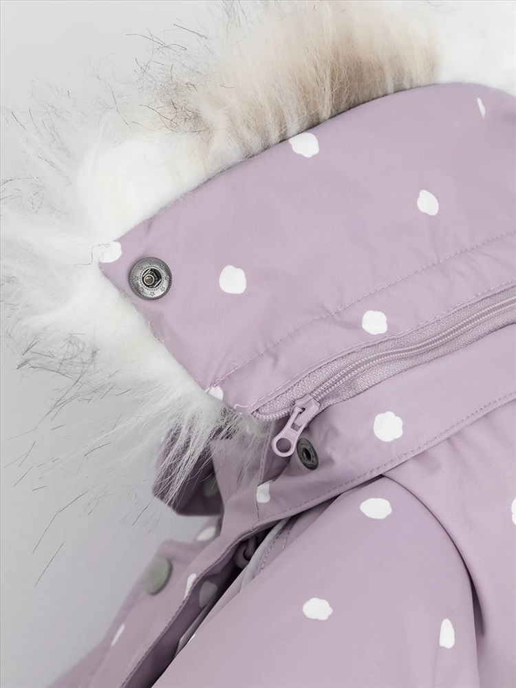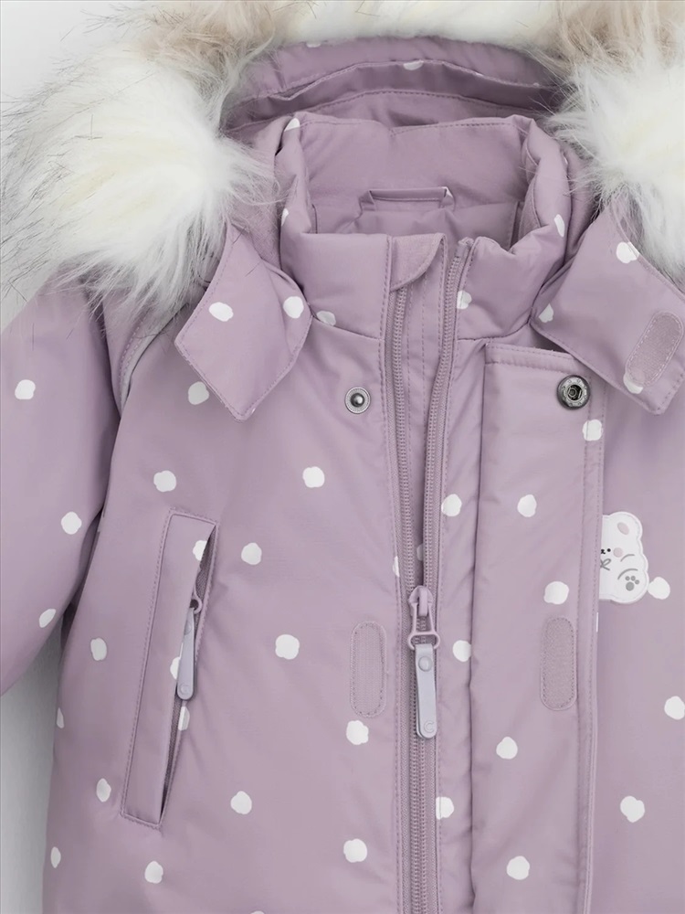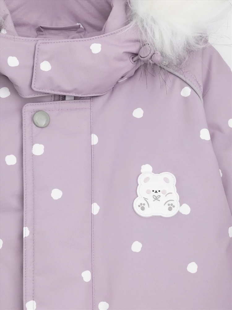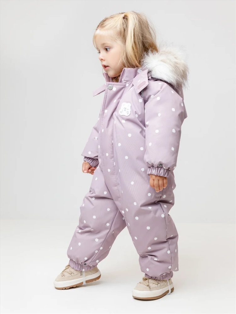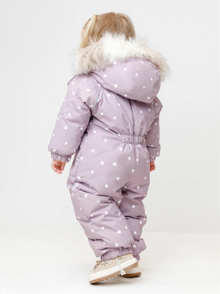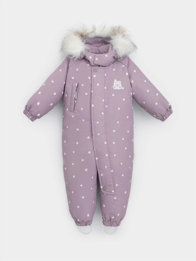 Зимний комбинезон ясельный с натуральным утеплителем из гусиного пуха (70%) и пера (30%). Выполнен из мембранной ткани с дополнительной тефлоновой обработкой, которая предохраняет изделие от загрязнений и отталкивает влагу. Подклад выполнен из 100% хлопка. Комбинезон застёгивается на молнию и внешнюю планку на липучках, предусмотрена защита подбородка. Несъёмный капюшон имеет эластичную утяжку со стопперами и отстёгивающийся мех на молнии. Резинка по спинке для лучшего прилегания. На груди карман на молнии. По рукавам и низу изделия эластичные манжеты, на ножках отстёгивающиеся силиконовые штрипки. В размерах с 68-74 по 80-86 в комплекте идут рукавицы и пинетки. Во всех изделиях верхнего ассортимента для безопасности ребёнка предусмотрены светоотражающие элементы.