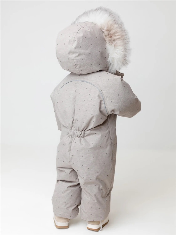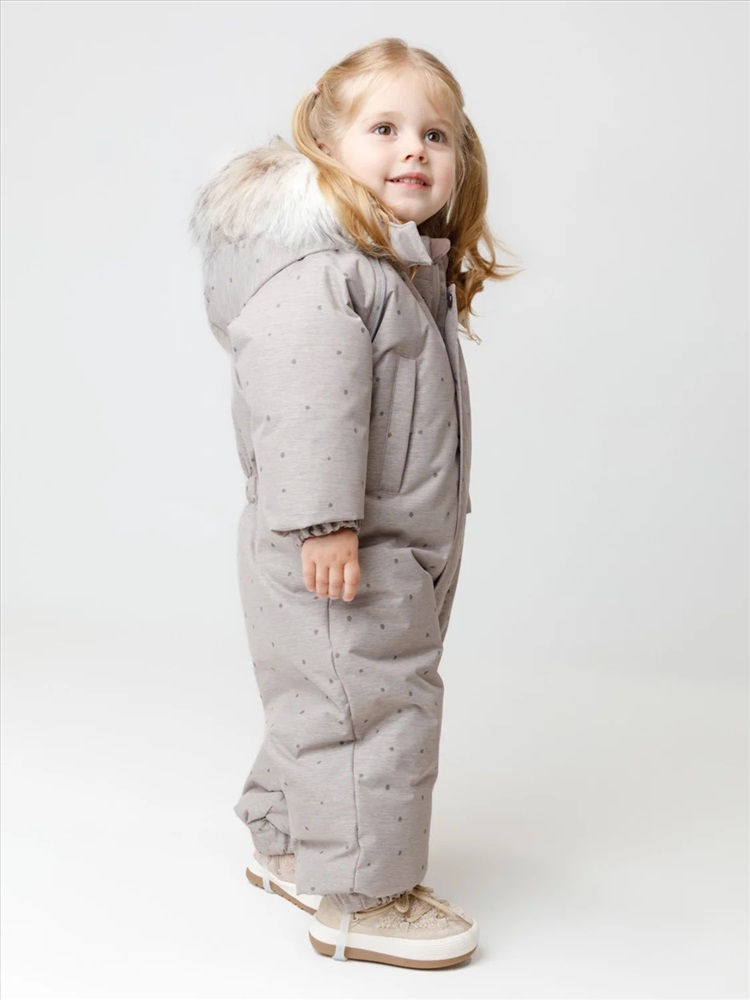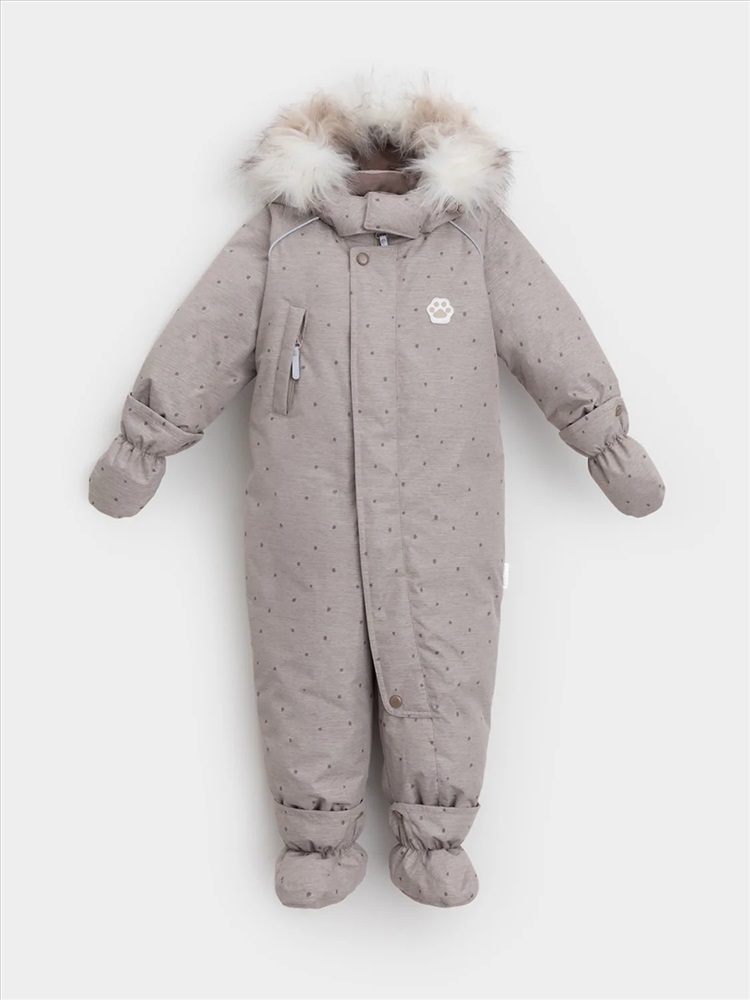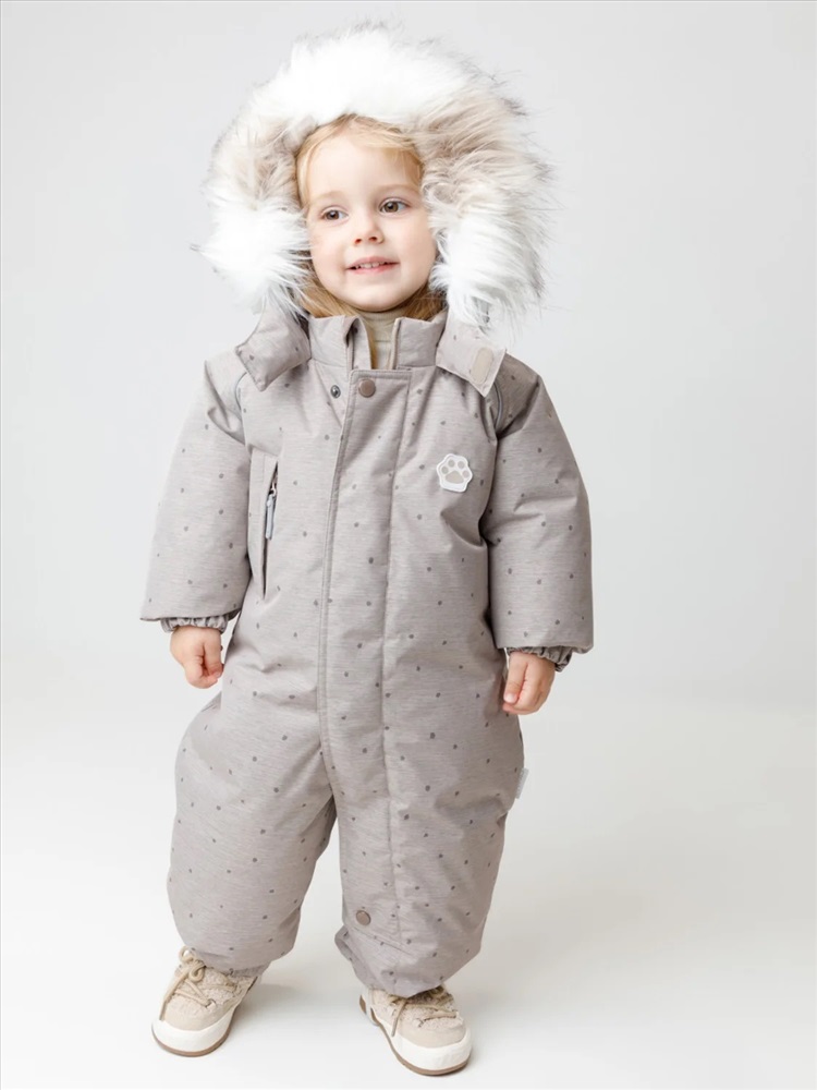 Зимний комбинезон ясельный с натуральным утеплителем из гусиного пуха (70%) и пера (30%). Выполнен из мембранной ткани с дополнительной тефлоновой обработкой, которая предохраняет изделие от загрязнений и отталкивает влагу. Подклад выполнен из 100% хлопка. Комбинезон застёгивается на молнию и внешнюю планку на липучках, предусмотрена защита подбородка. Несъёмный капюшон имеет эластичную утяжку со стопперами и отстёгивающийся мех на молнии. Резинка по спинке для лучшего прилегания. На груди карман на молнии. По рукавам и низу изделия эластичные манжеты, на ножках отстёгивающиеся силиконовые штрипки. В размерах с 68-74 по 80-86 в комплекте идут рукавицы и пинетки. Во всех изделиях верхнего ассортимента для безопасности ребёнка предусмотрены светоотражающие элементы.