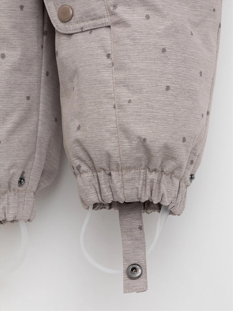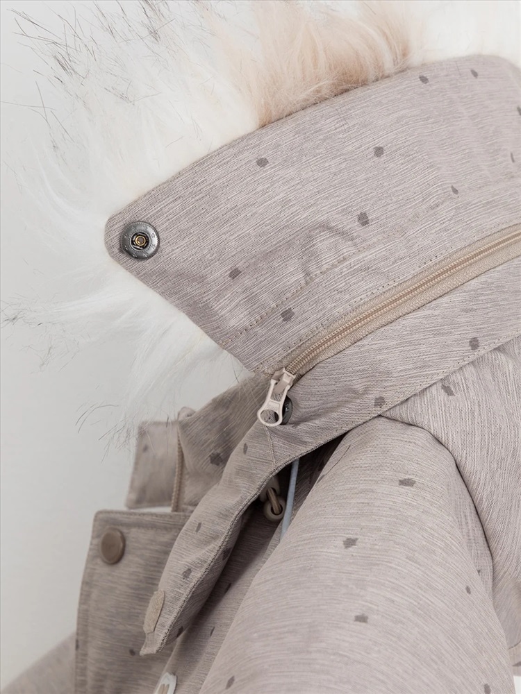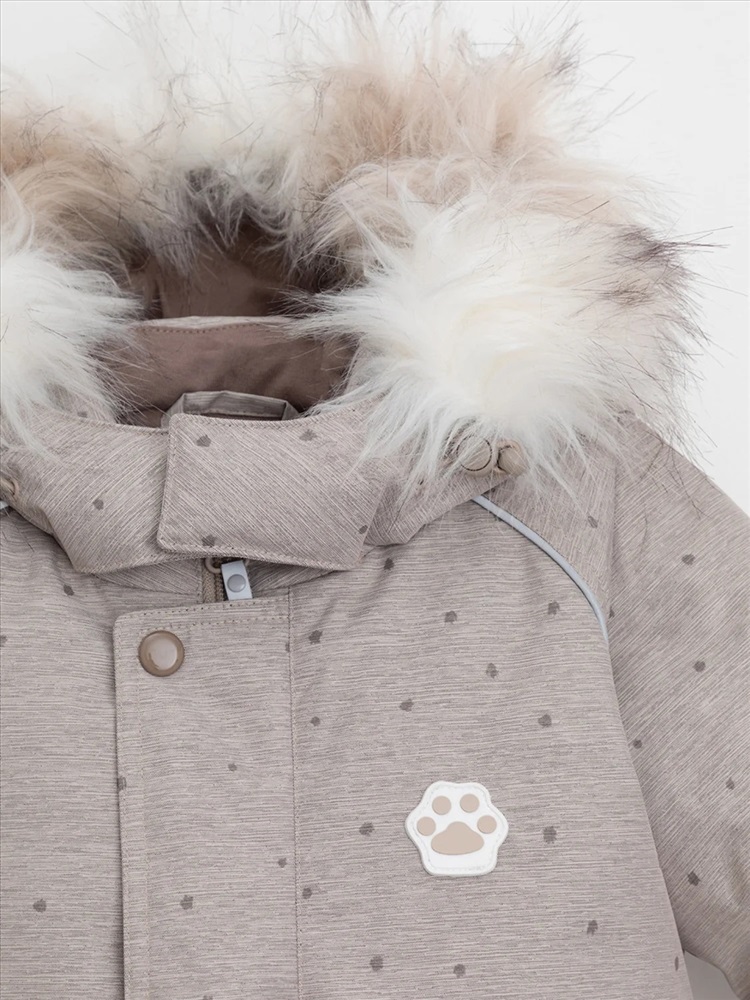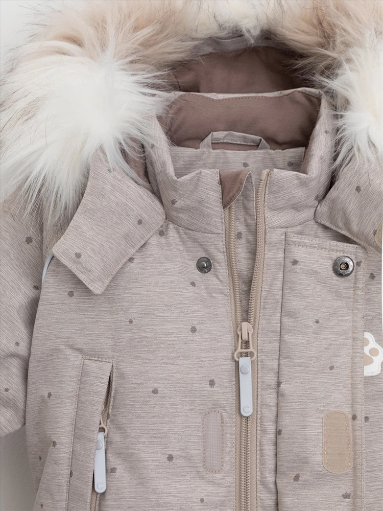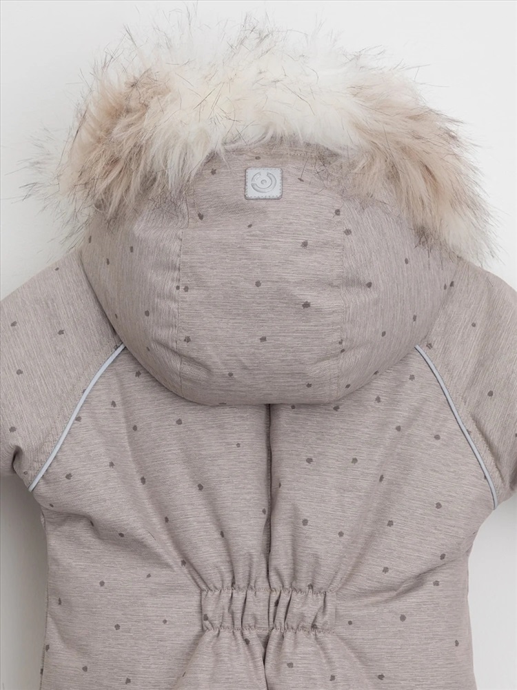 Зимний комбинезон ясельный с натуральным утеплителем из гусиного пуха (70%) и пера (30%). Выполнен из мембранной ткани с дополнительной тефлоновой обработкой, которая предохраняет изделие от загрязнений и отталкивает влагу. Подклад выполнен из 100% хлопка. Комбинезон застёгивается на молнию и внешнюю планку на липучках, предусмотрена защита подбородка. Несъёмный капюшон имеет эластичную утяжку со стопперами и отстёгивающийся мех на молнии. Резинка по спинке для лучшего прилегания. На груди карман на молнии. По рукавам и низу изделия эластичные манжеты, на ножках отстёгивающиеся силиконовые штрипки. В размерах с 68-74 по 80-86 в комплекте идут рукавицы и пинетки. Во всех изделиях верхнего ассортимента для безопасности ребёнка предусмотрены светоотражающие элементы.