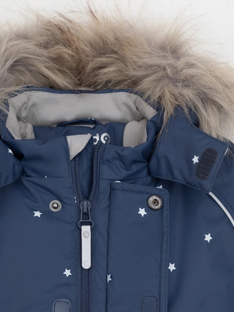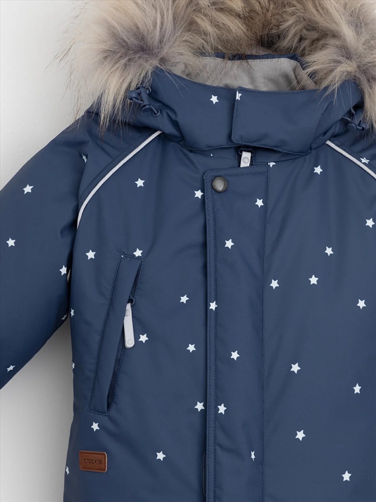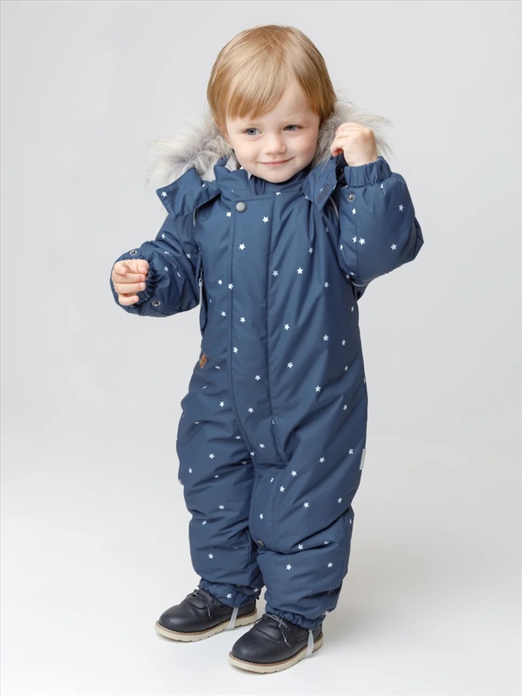 Зимний комбинезон ясельный с утеплителем Fellex®: 300 г/м2. Выполнен из мембранной ткани с дополнительной тефлоновой обработкой, которая предохраняет изделие от загрязнений и отталкивает влагу. Подклад выполнен из 100% хлопка. Комбинезон застёгивается на молнию и внешнюю планку на липучках, предусмотрена защита подбородка. Несъёмный капюшон имеет эластичную утяжку со стопперами и отстёгивающийся мех на молнии. Резинка по спинке для лучшего прилегания. На груди карман на молнии. По рукавам и низу изделия эластичные манжеты, на ножках отстёгивающиеся силиконовые штрипки. В размерах 74-80 и 80-86 в комплекте идут рукавицы и пинетки. Во всех изделиях верхнего ассортимента для безопасности ребёнка предусмотрены светоотражающие элементы.