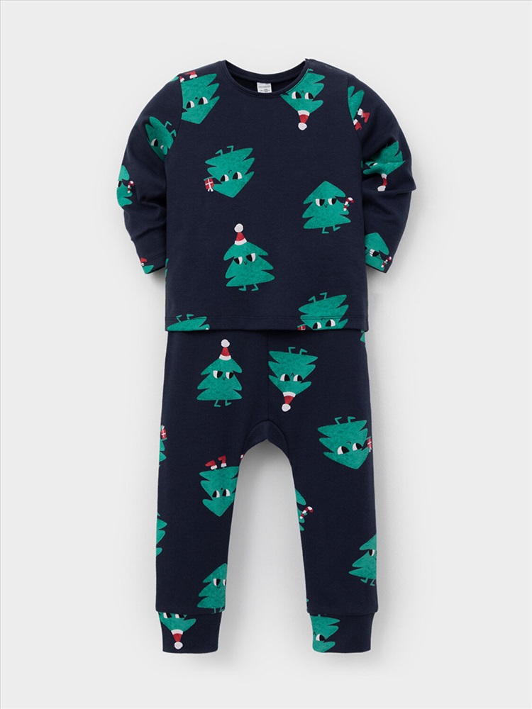 Трикотажная пижама из натурального хлопка. Джемпер с длинными втачными рукавами и брюки с эластичной резинкой в поясе. Отлично подойдёт для создания праздничных образов или в качестве подарка малышу на Новый год и Рождество. Джемпер застёгивается на кнопки. По низу брюк мягкие манжеты. Оригинальная набивка выполнена из стойких текстильных гипоаллергенных красителей. Изделие сохраняет цвет и форму после многократных стирок. Все трикотажные полотна производятся в соответствии с нормами швейцарского сертификата ЭкоТекс.