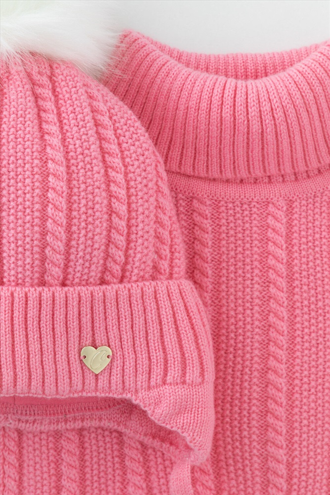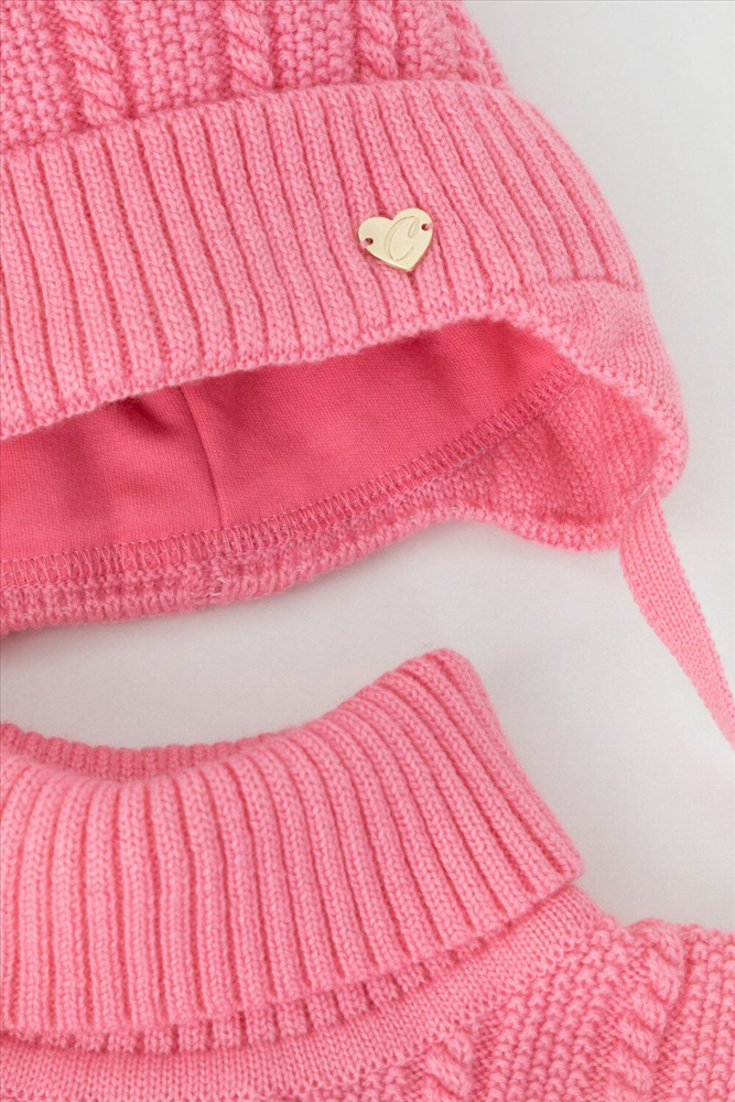 Комплект для девочки: шапка и манишка из полушерстяной пряжи. Шапка на завязках с синтепоновым утеплителем. Подклад из натурального хлопка. Полностью закрывает голову, уши и шею, защищая ребёнка от холодного воздуха и ветра. На макушке помпон. Манишка с высоким воротником с эластичным отворотом.