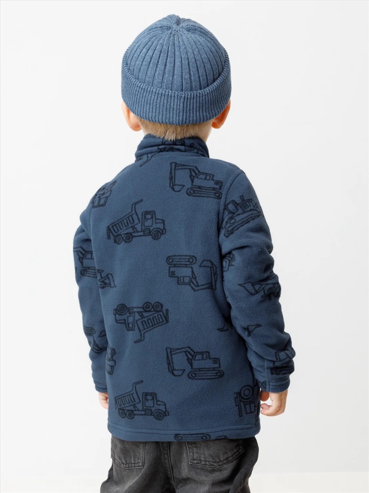 Флисовая куртка для мальчика. У изделия высокий воротник и застёжка на молнию с мягкой защитой шеи и подбородка. По бокам два кармана. Оригинальная набивка выполнена из стойких гипоаллергенных текстильных красителей. Куртка сохраняет цвет и форму после многократных стирок.