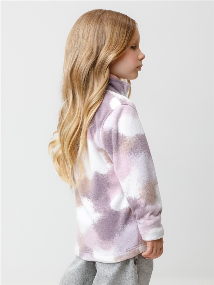 Флисовая куртка для девочки. У изделия высокий воротник и застёжка на молнию с мягкой защитой шеи и подбородка. По бокам два кармана. Оригинальная набивка выполнена из стойких гипоаллергенных текстильных красителей. Куртка сохраняет цвет и форму после многократных стирок.
