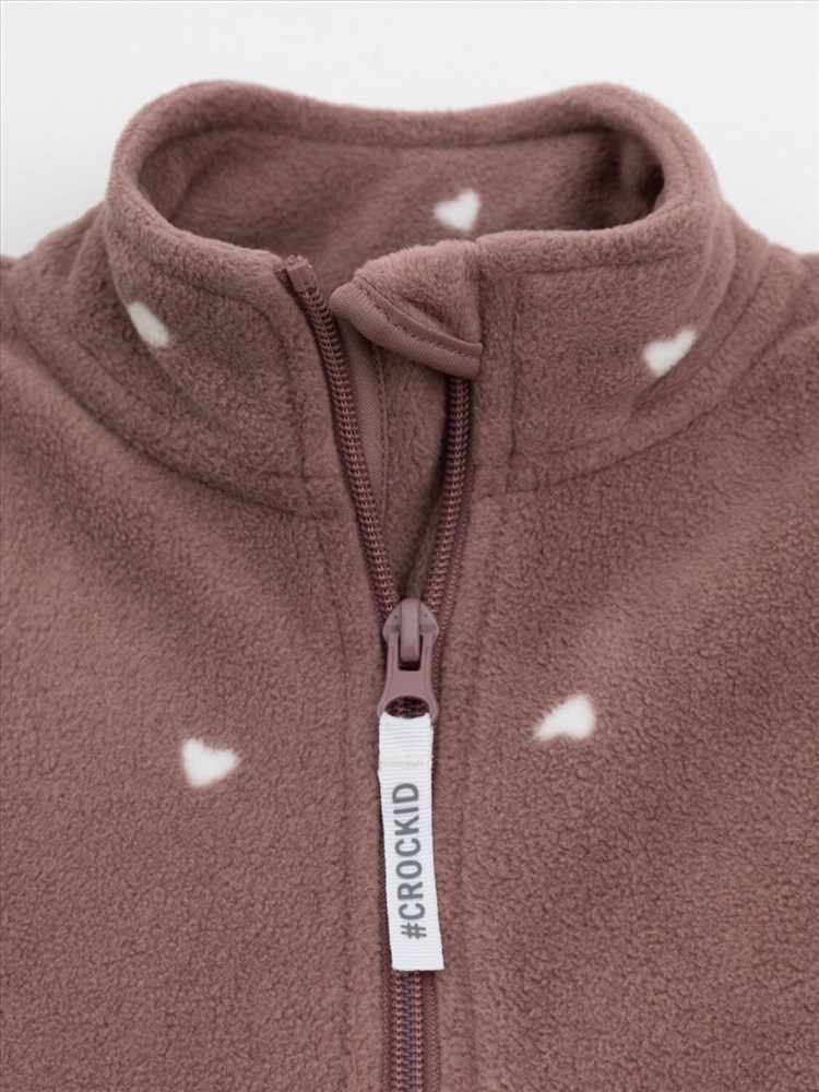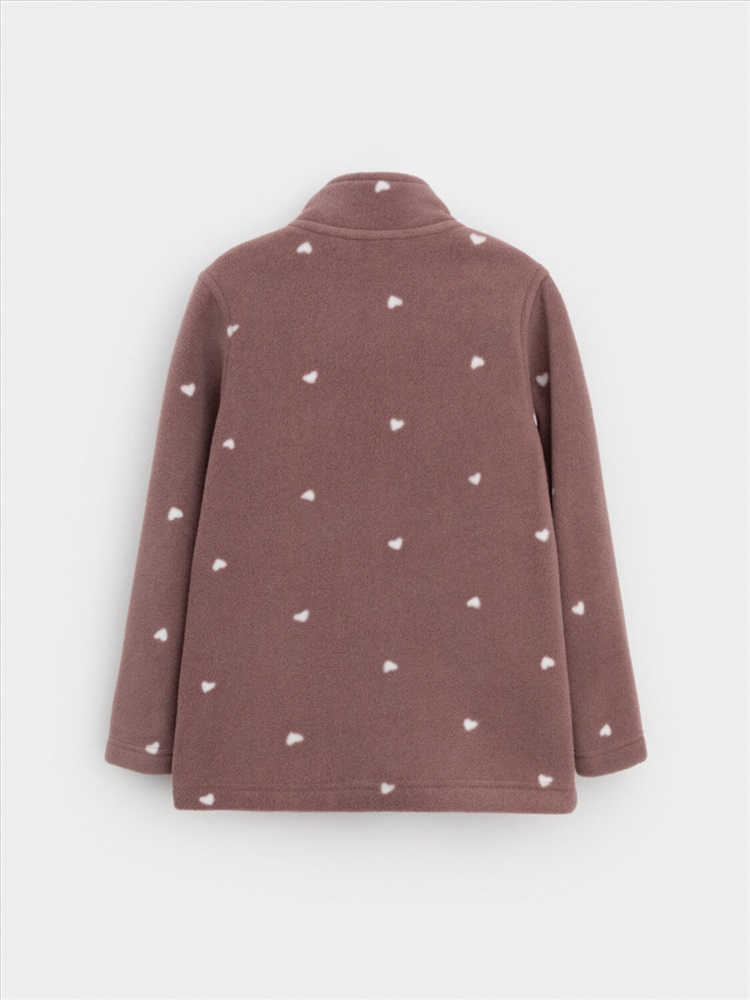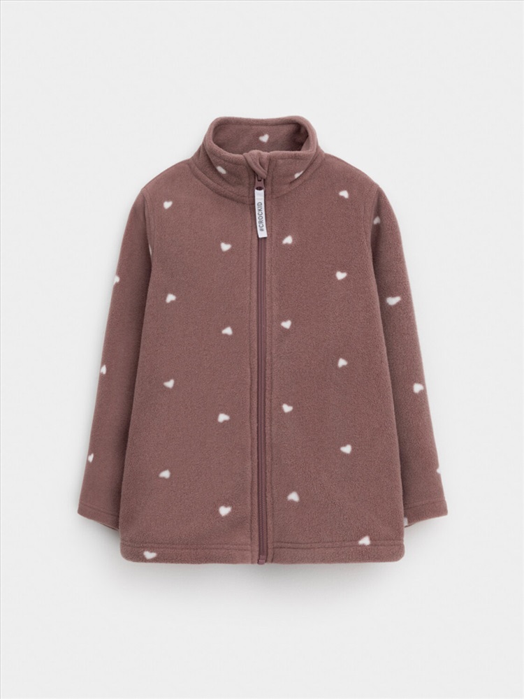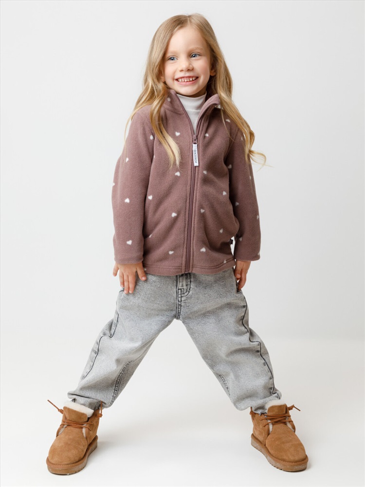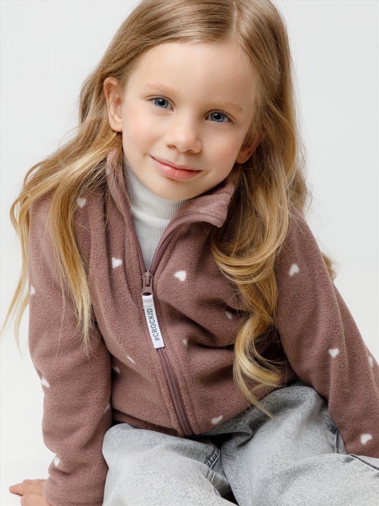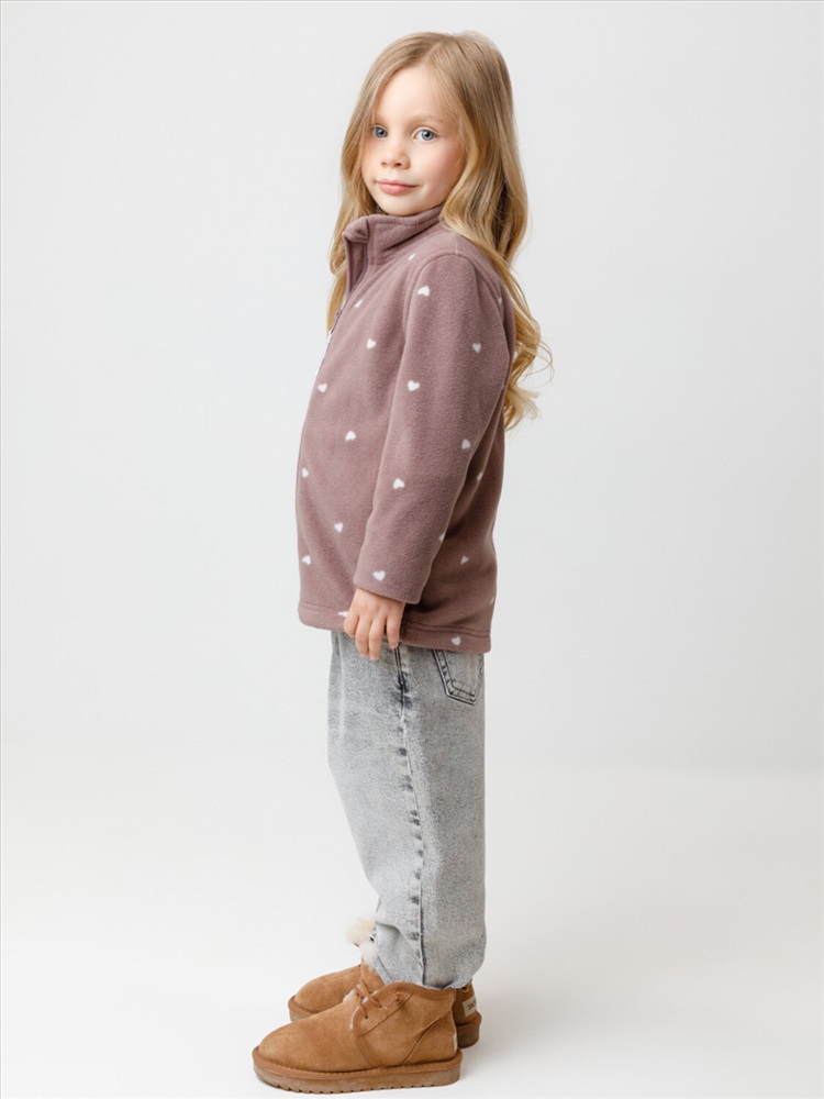 Флисовая куртка для девочки. У изделия высокий воротник и застёжка на молнию с мягкой защитой шеи и подбородка. По бокам два кармана. Оригинальная набивка выполнена из стойких гипоаллергенных текстильных красителей. Куртка сохраняет цвет и форму после многократных стирок.